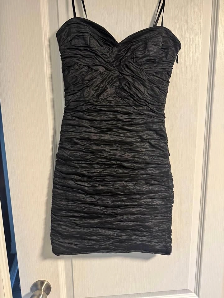 Stylish BCBGMAXAZRIA black ruched mini dress. Size 0. Features spaghetti straps and a sweetheart neckline. Bodycon fit, very flattering.