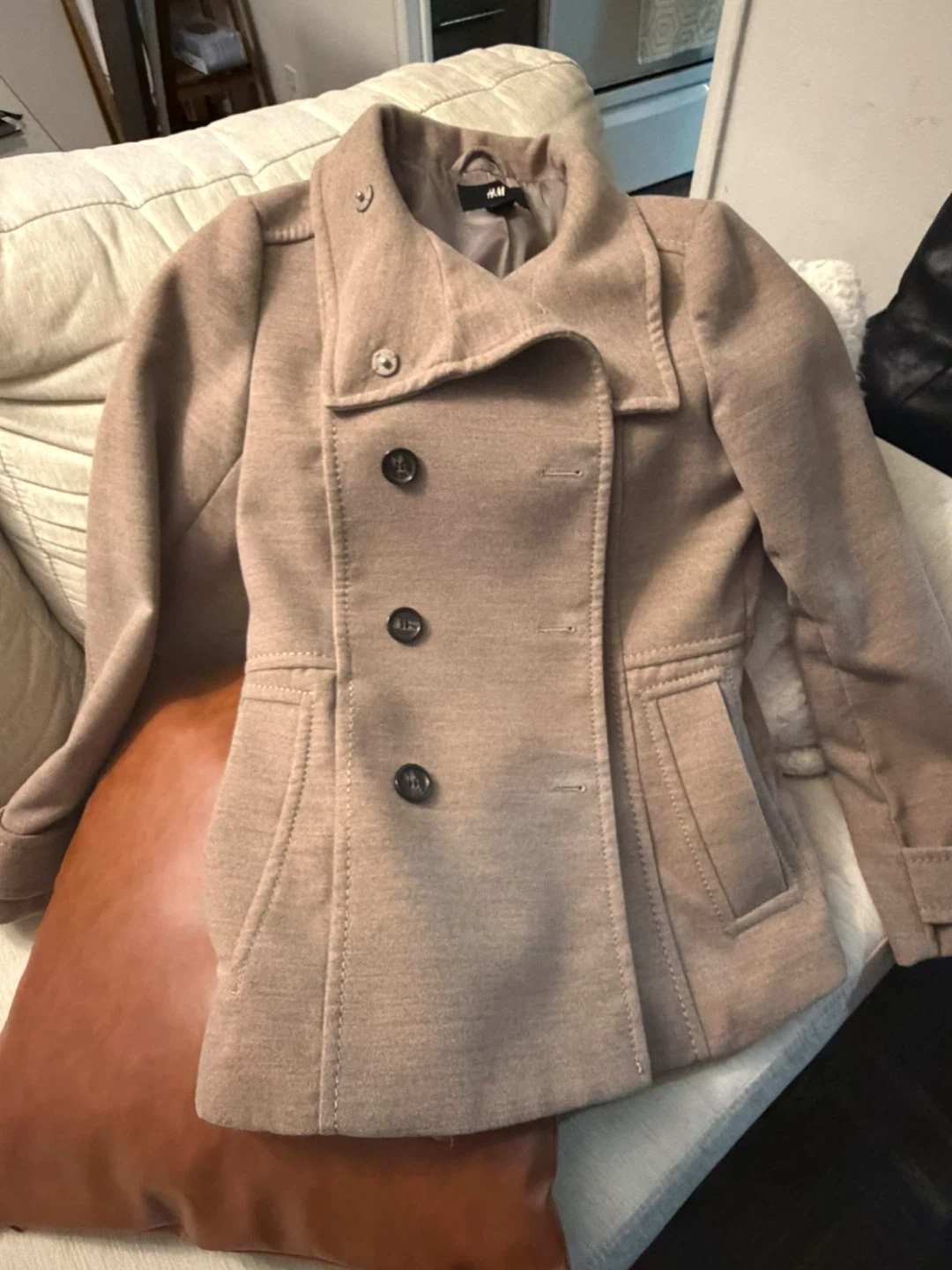 This H&M pea coat is a size 8, made in China. It's a stylish beige colour, perfect for transitional weather. Double-breasted design with button closure.