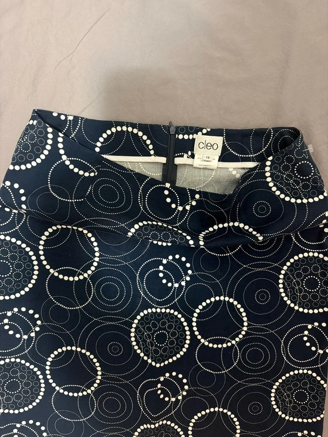 This is a Cleo brand skirt with a stylish navy blue and white circular pattern, perfect for adding a touch of elegance to your wardrobe. The skirt is a size 14 and offers a comfortable and flattering fit. It's in good condition, ready for its next chapter! Key Features: * Brand: Cleo * Size: 14 * Colour: Navy Blue and White * Pattern: Circular If the ad is up, the item is available! A-4