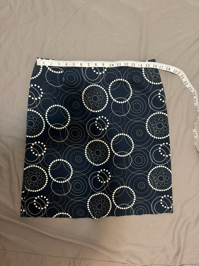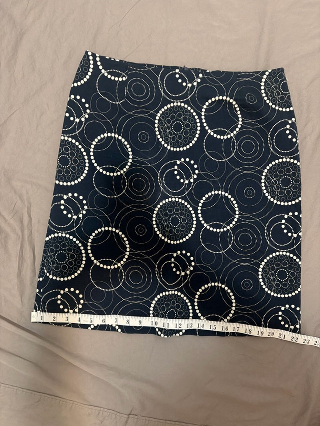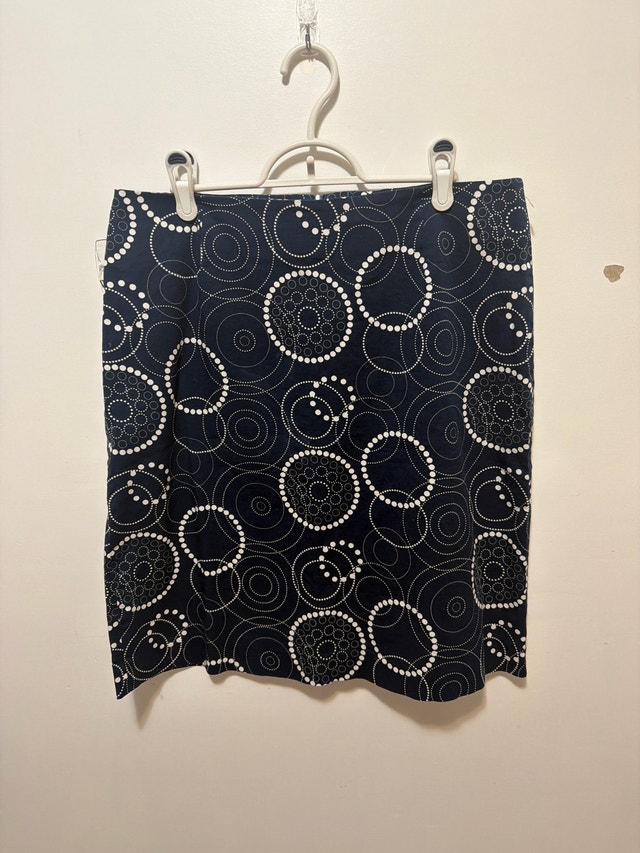 This is a Cleo brand skirt with a stylish navy blue and white circular pattern, perfect for adding a touch of elegance to your wardrobe. The skirt is a size 14 and offers a comfortable and flattering fit. It's in good condition, ready for its next chapter! Key Features: * Brand: Cleo * Size: 14 * Colour: Navy Blue and White * Pattern: Circular If the ad is up, the item is available! A-4