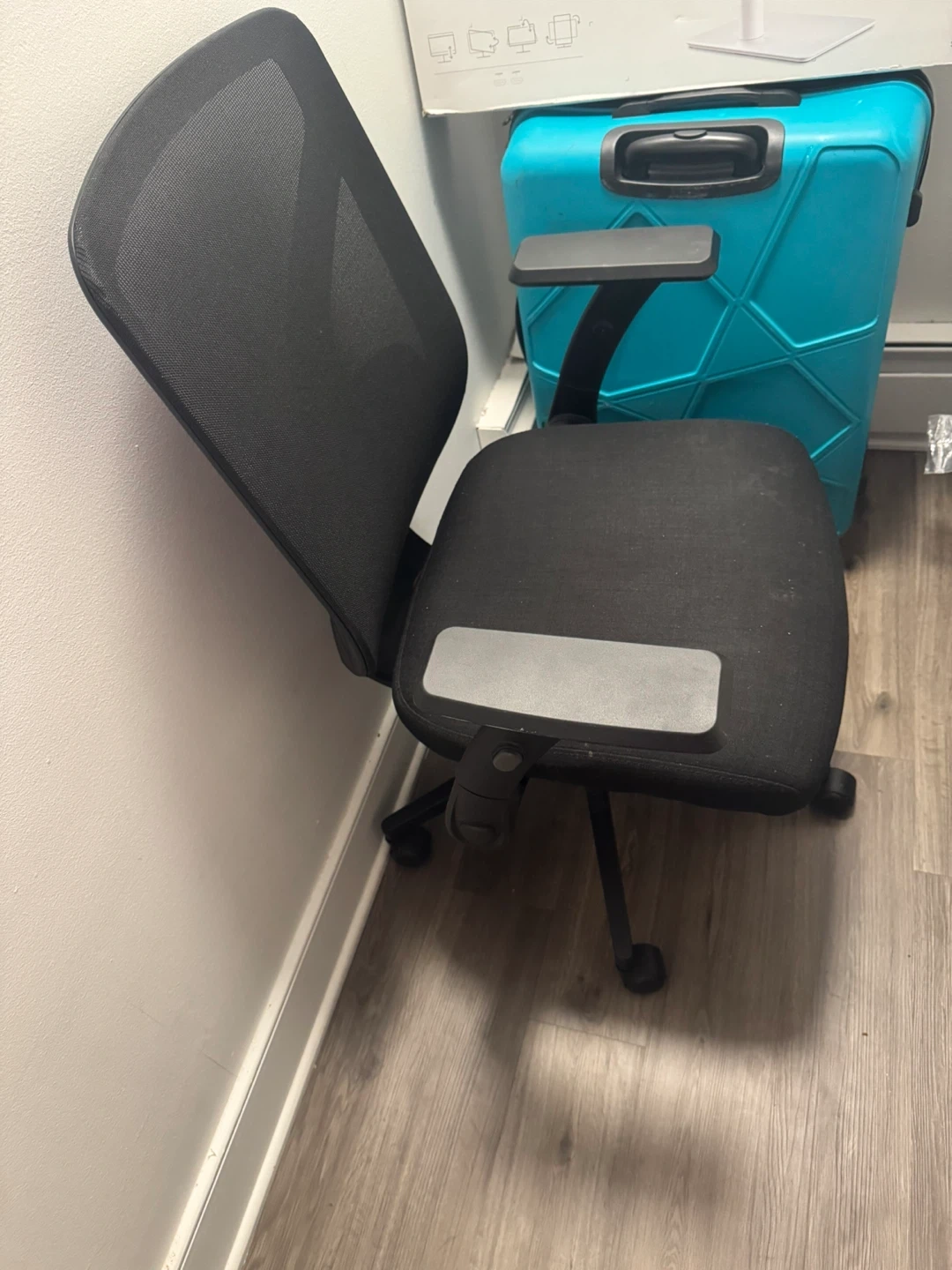This is a black mesh back office chair. It features adjustable armrests and a comfortable padded seat. Mesh back allows for breathability. The chair has a five-star base with wheels for easy mobility.