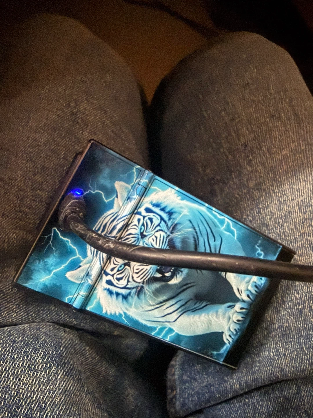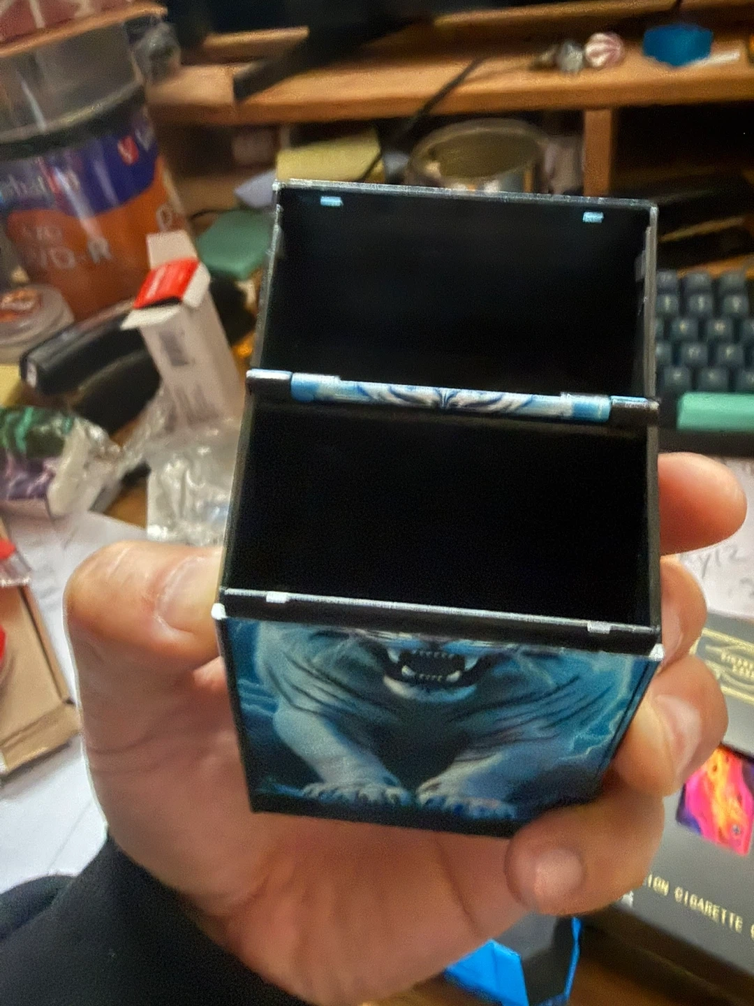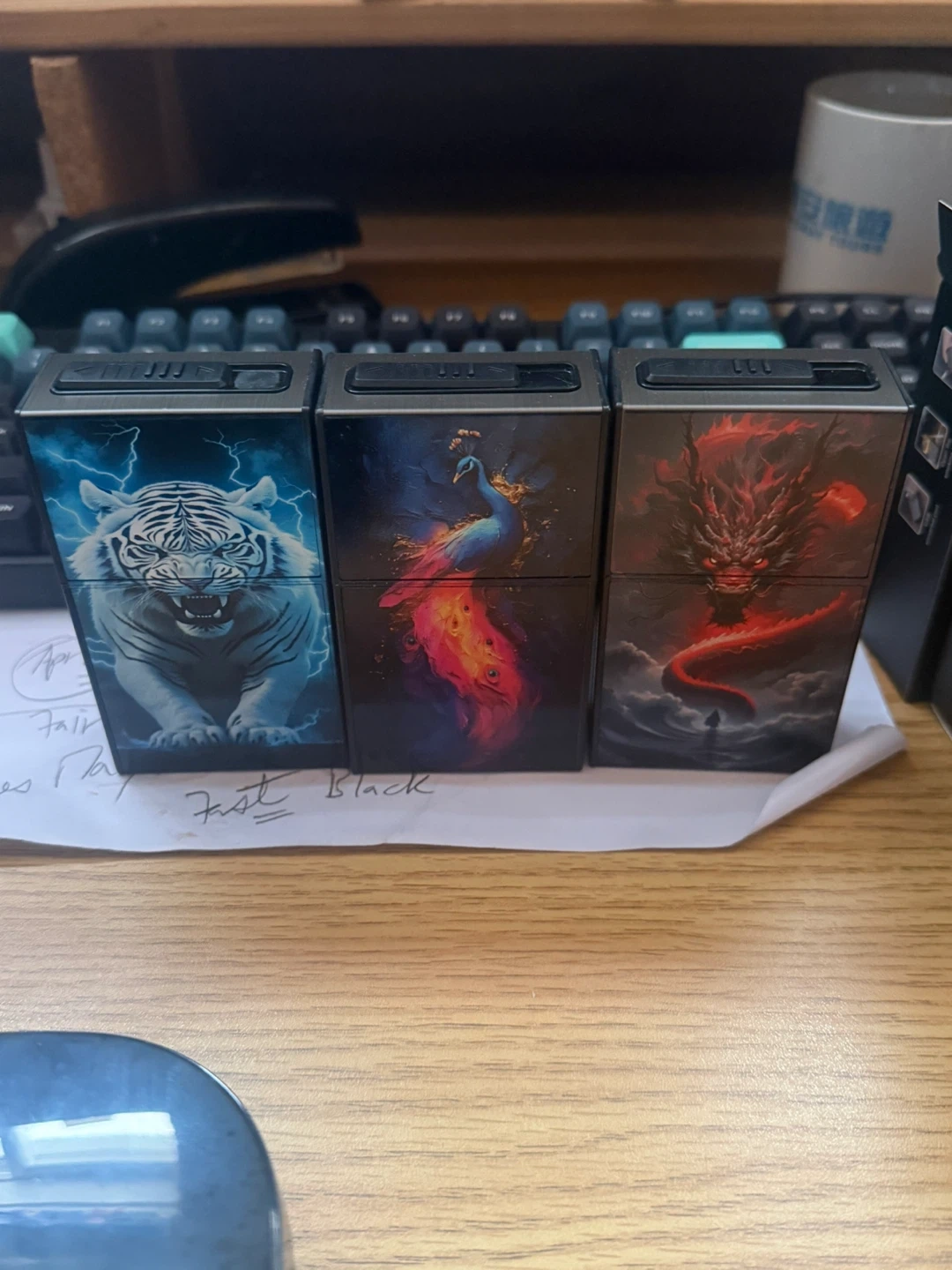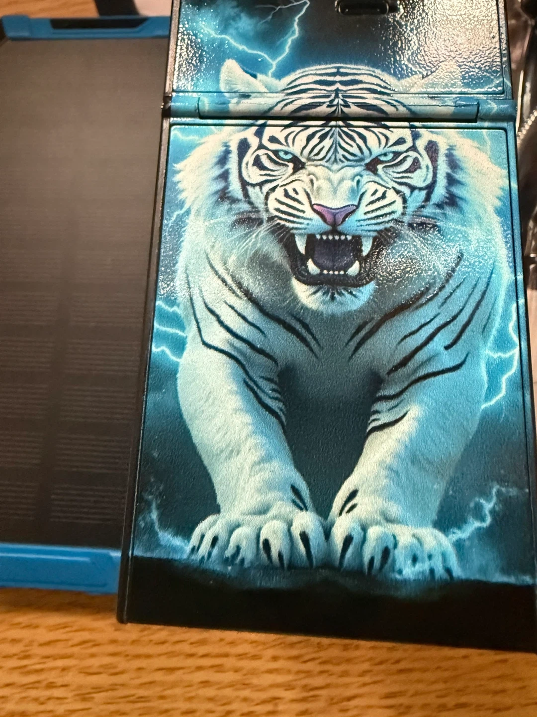 This case holds cigarettes and features a striking white tiger design with lightning accents. It's made of metal. Keep your smokes protected and stylish!