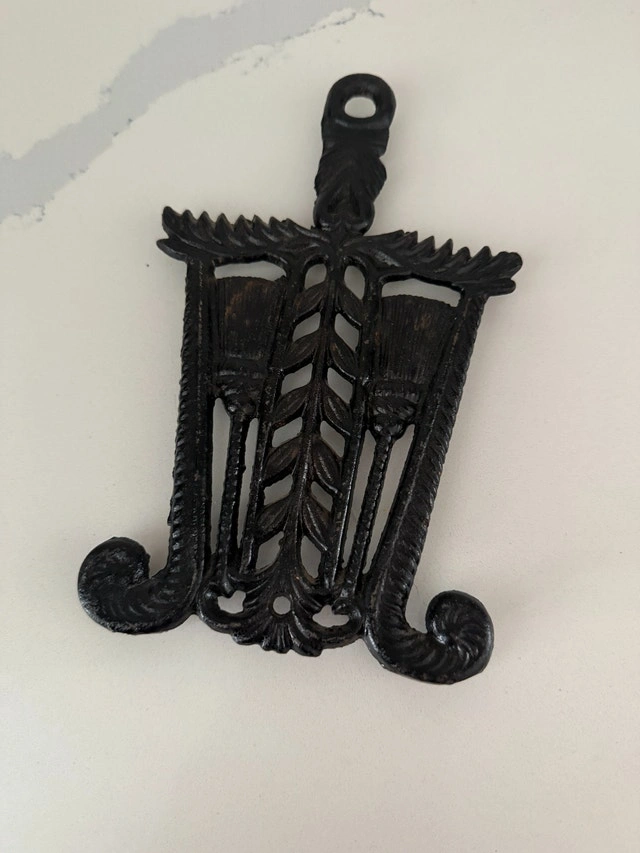 Vintage Black Cast Iron Trivet Broom and Wheat Footed