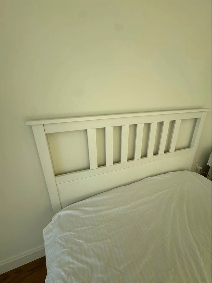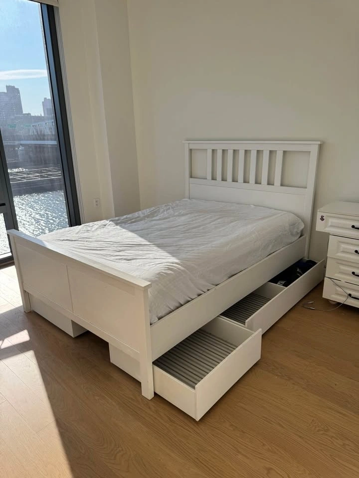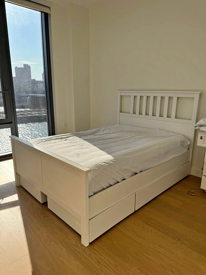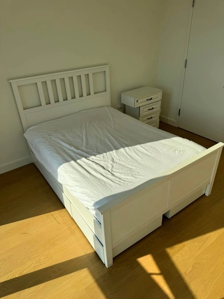 Full size white bed frame with 4 large drawers from IKEA.