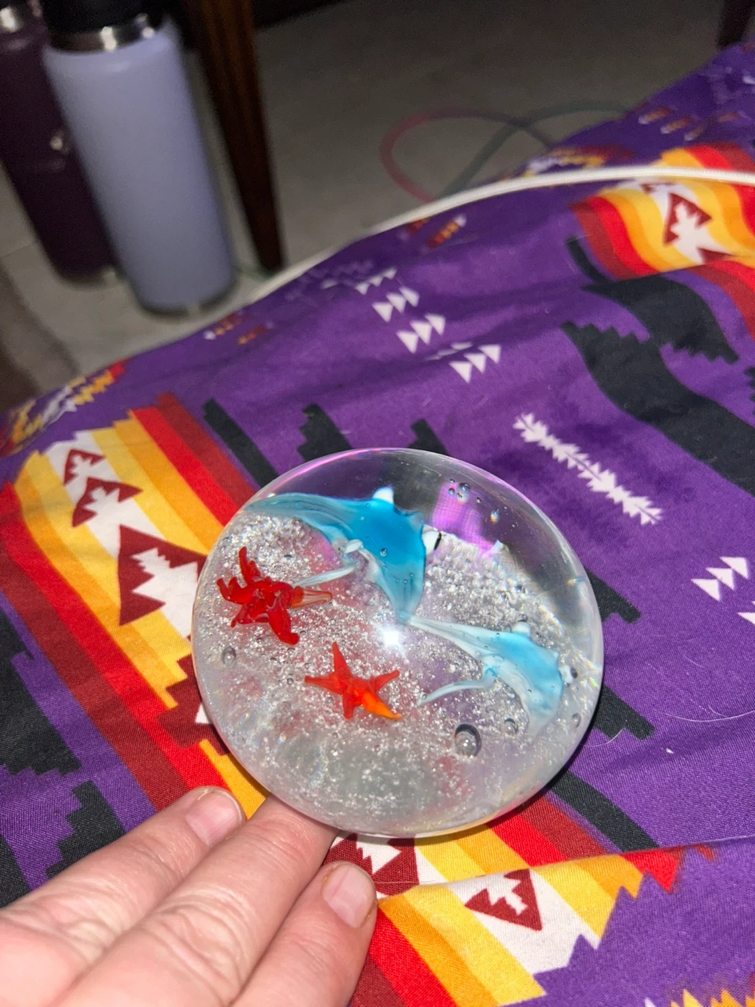This is a clear glass paperweight featuring blue sea creatures and red starfish. It contains glitter and small bubbles suspended in liquid. It's a decorative piece that could also be used to hold down papers.