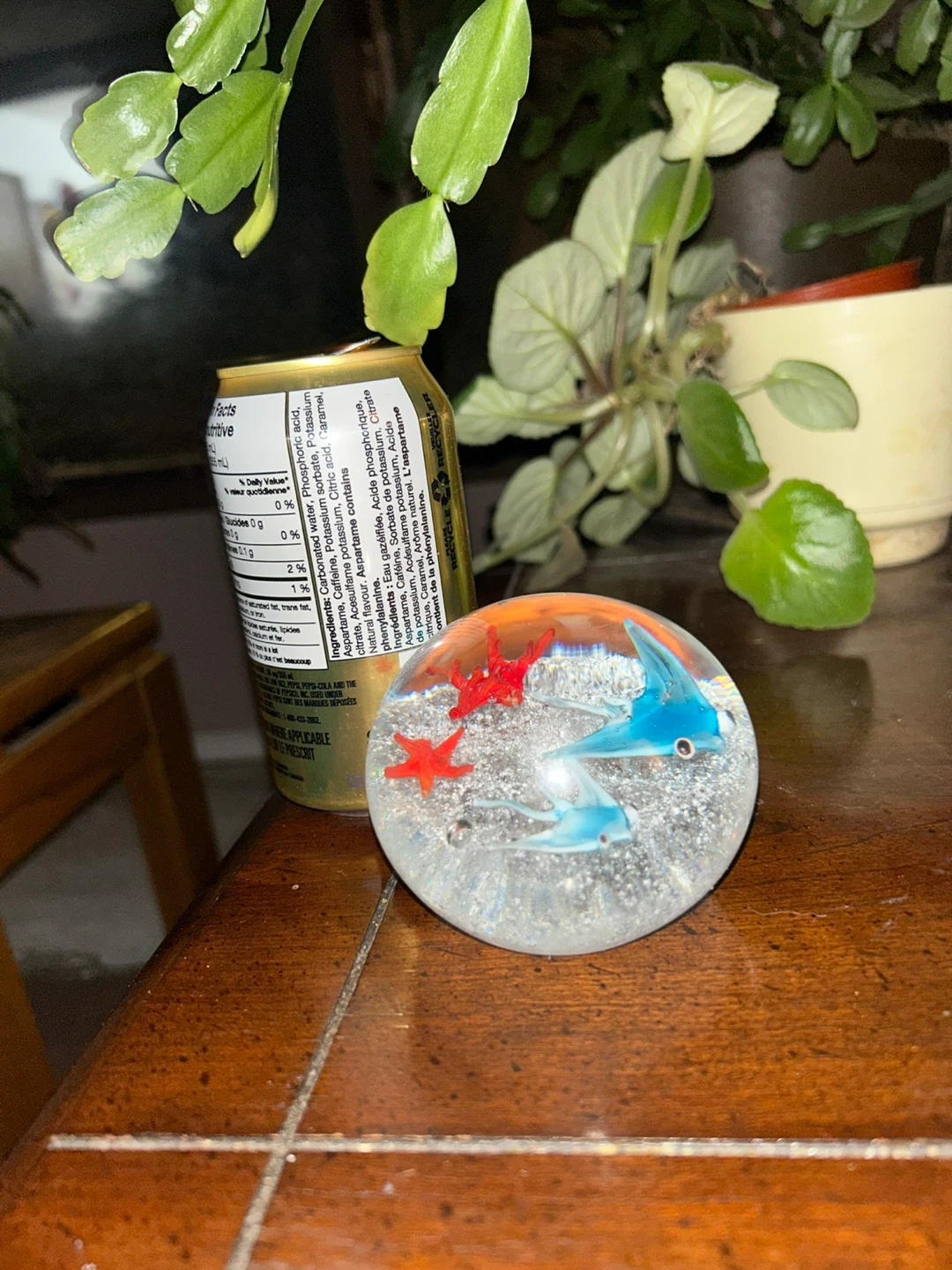 This is a clear glass paperweight featuring blue sea creatures and red starfish. It contains glitter and small bubbles suspended in liquid. It's a decorative piece that could also be used to hold down papers.
