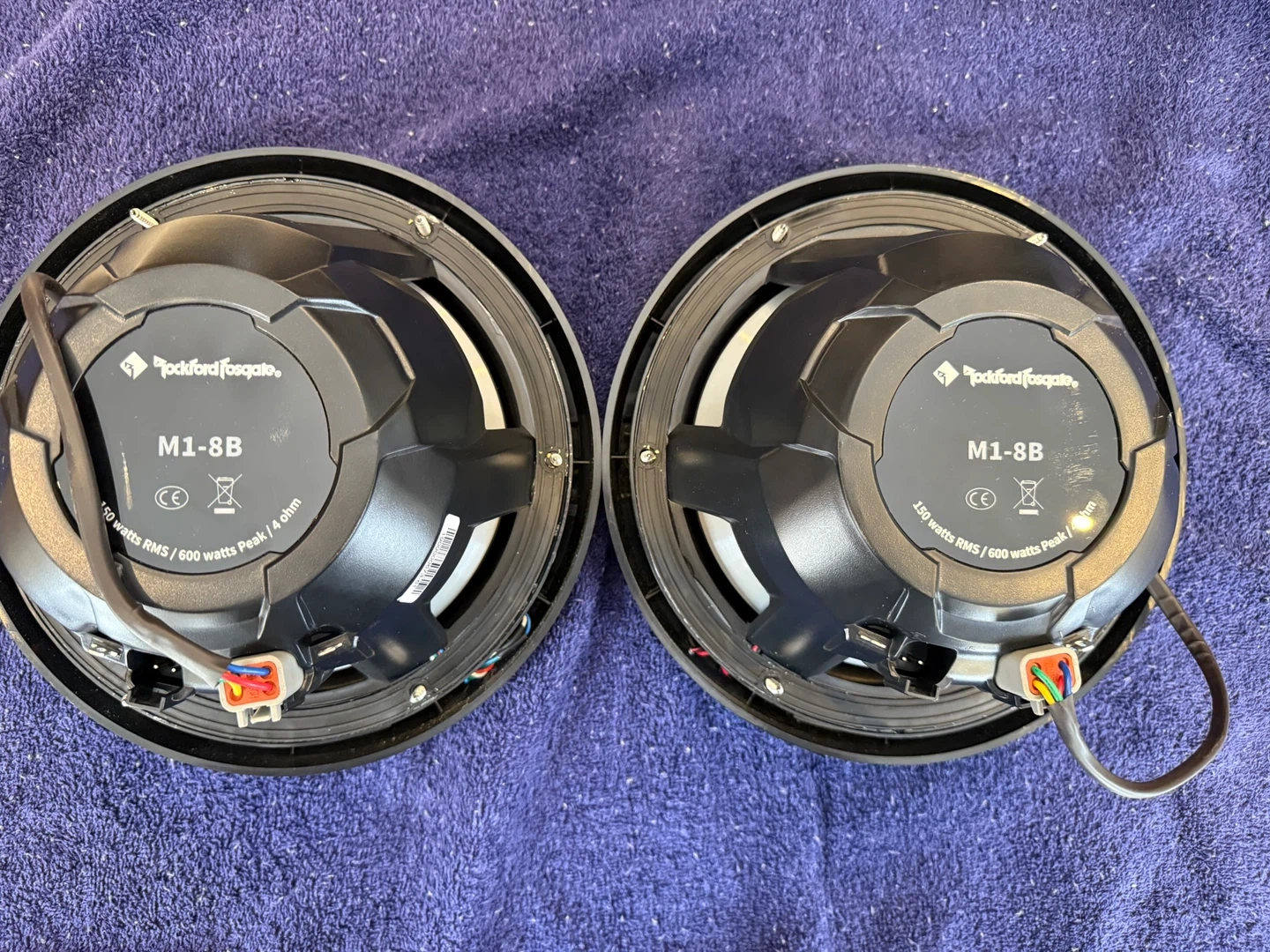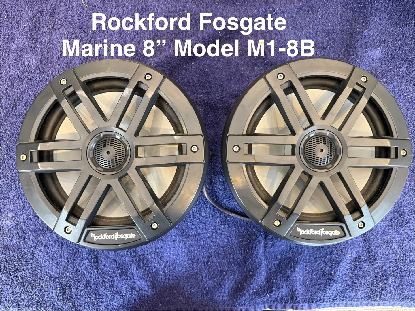 Pair of Rockford Fosgate M1-8B marine 8" speakers. They handle 150 watts RMS / 600 watts Peak power and are 4 ohm. Built for marine environments!