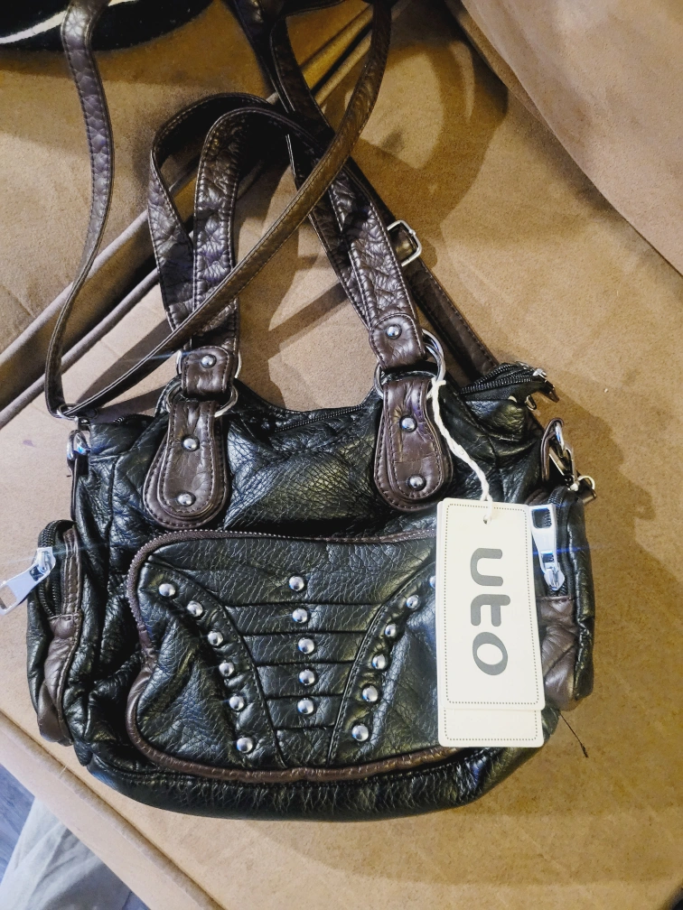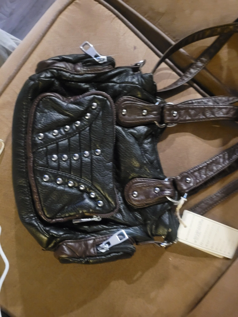 Small handbag, dark brown and black faux leather. Studded detailing. Features two straps, one for carrying on the shoulder or across the body. Zipper closures. Multiple pockets. nit my style hopefully someone else can appreciate this nice brand new purse