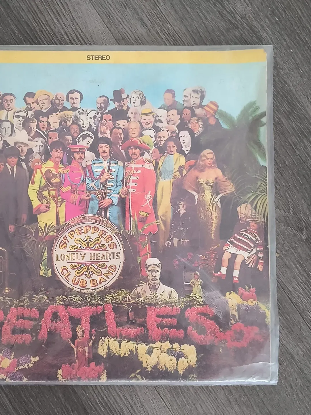 The Beatles' iconic Sgt. Pepper's Lonely Hearts Club Band vinyl record. This Capitol Records stereo pressing features the classic lineup and the full track listing. A must-have for any music collector!