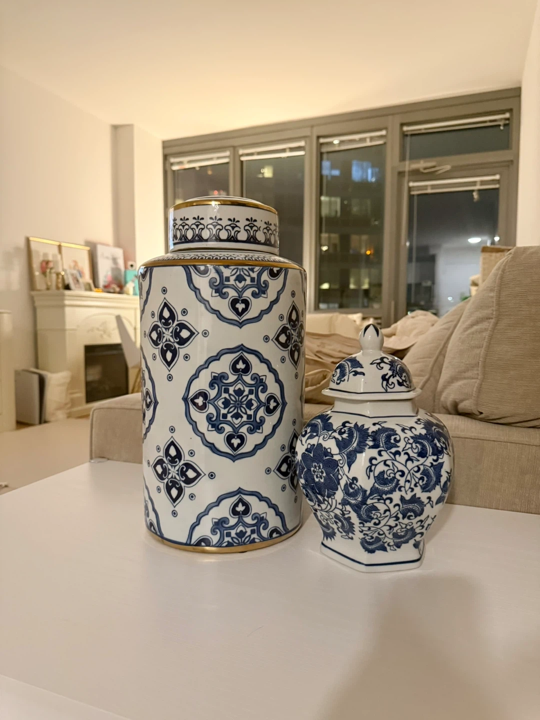 Set of two ceramic ginger jars featuring a classic blue and white Chinoiserie pattern. Both jars have decorative lids and gold accents on the rims. They're perfect for adding a touch of traditional elegance to any room