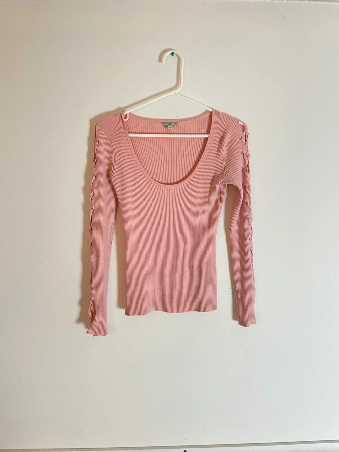 GUESS Pink Ribbed Lace-Up Sleeve Sweater
