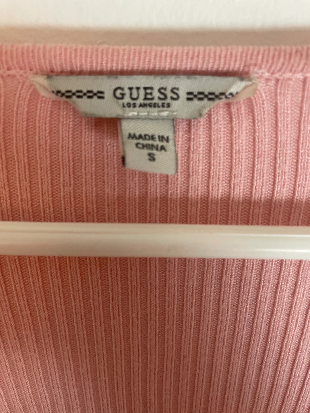 This is a GUESS pink ribbed sweater with a scoop neck.