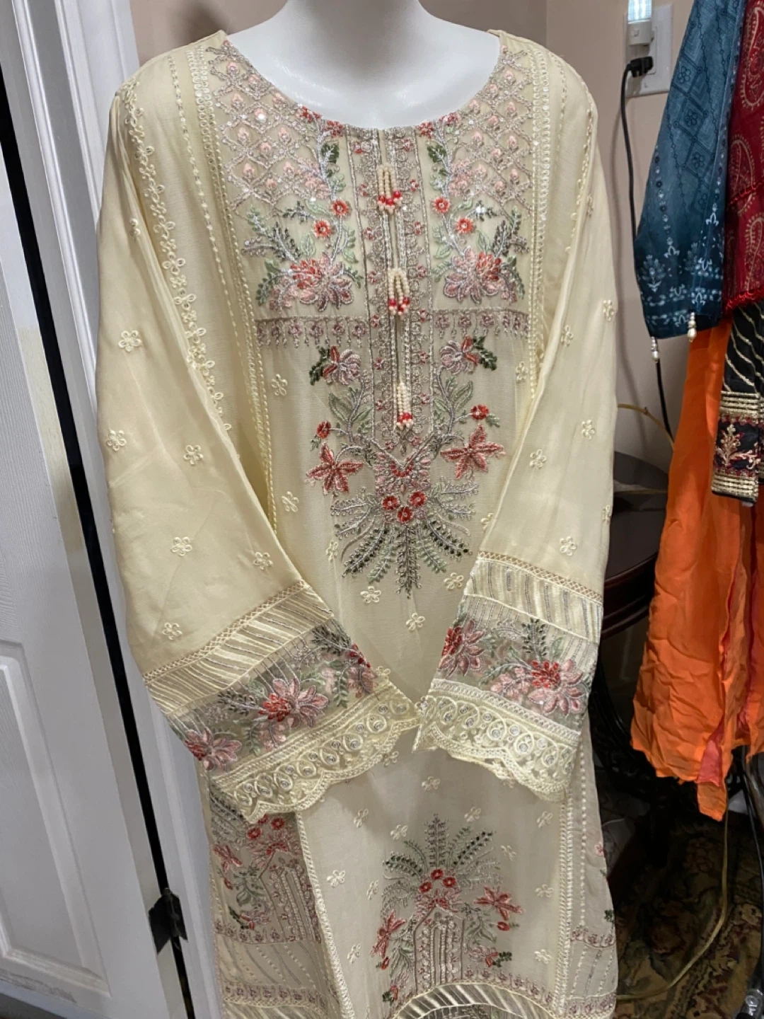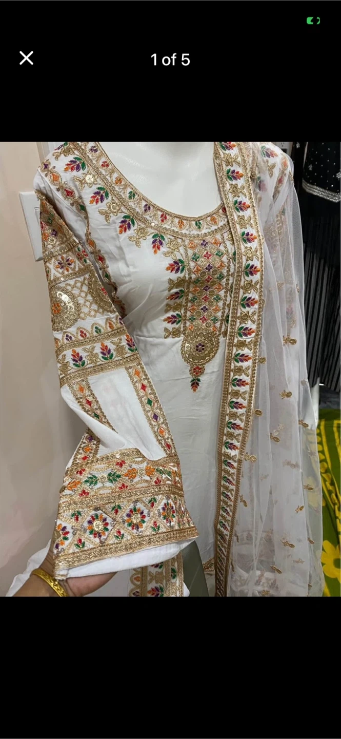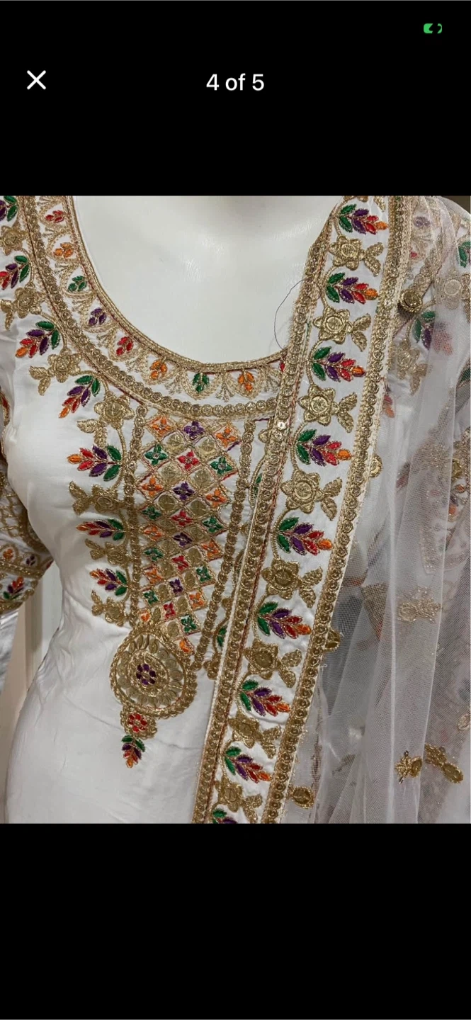Beautifully embroidered white three-piece suit with a sheer dupatta. Features intricate multi-coloured threadwork and gold detailing on the neckline, sleeves, and hem. Pants are included. Perfect for festive occasions.