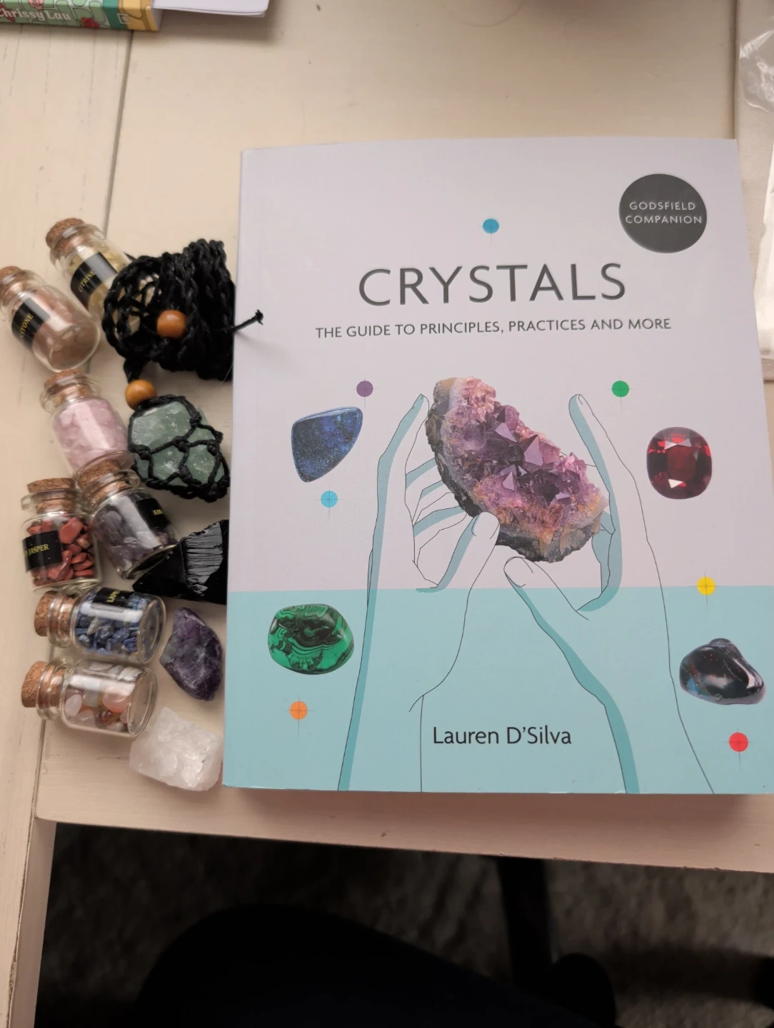 This is the Godsfield Companion book 'Crystals: The Guide to Principles, Practices and More'. It's written by Lauren D'Silva. The book covers various aspects of crystals. It would be useful for anyone interested in learning about crystal properties and uses. Includes various crystals