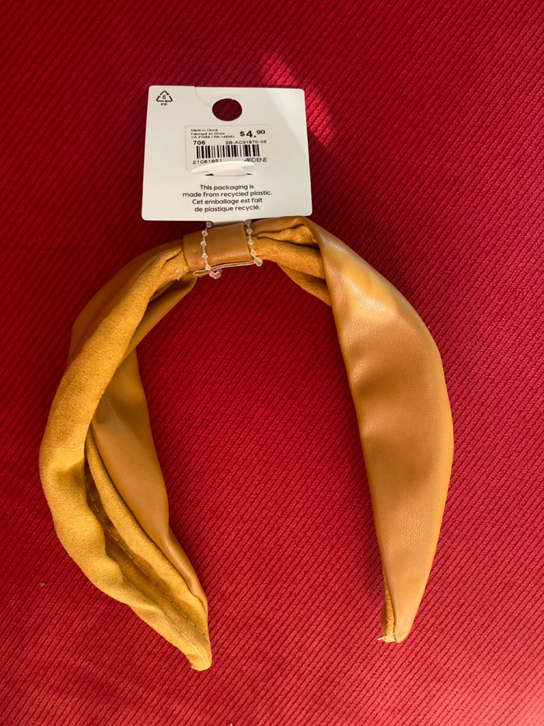 A stylish yellow twisted headband from Ardene. It's made with a faux leather material. This accessory is great for adding a pop of colour to any outfit!