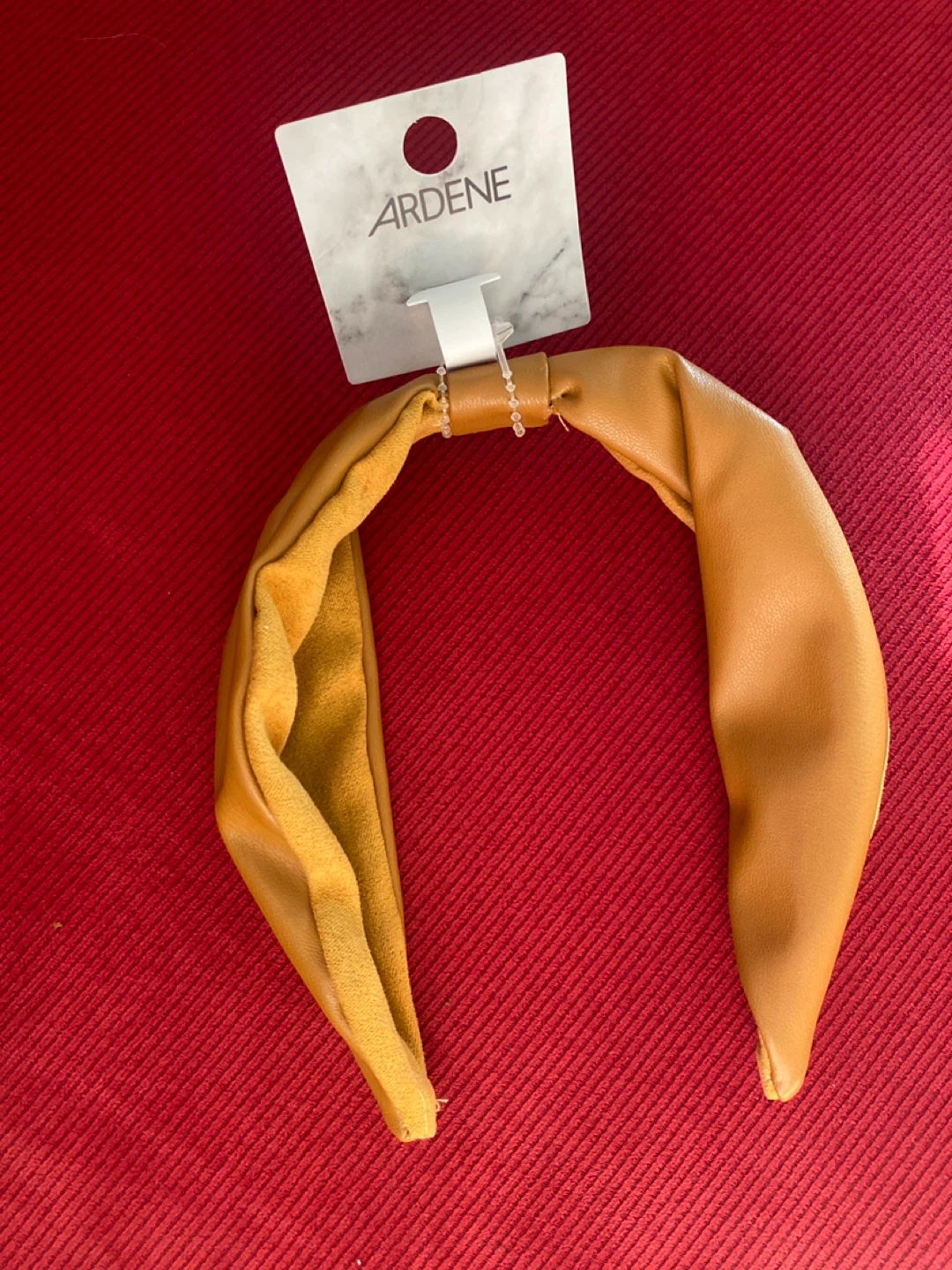 A stylish yellow twisted headband from Ardene. It's made with a faux leather material. This accessory is great for adding a pop of colour to any outfit!