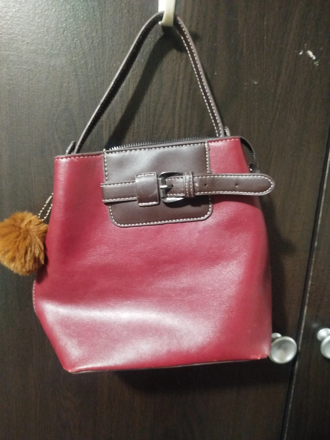 Selling a cute burgundy bucket bag! It's made of leather and has a brown accent strap with a buckle. There's also a fluffy pom-pom attached. It's in good condition with some minor wear on the bottom corners.