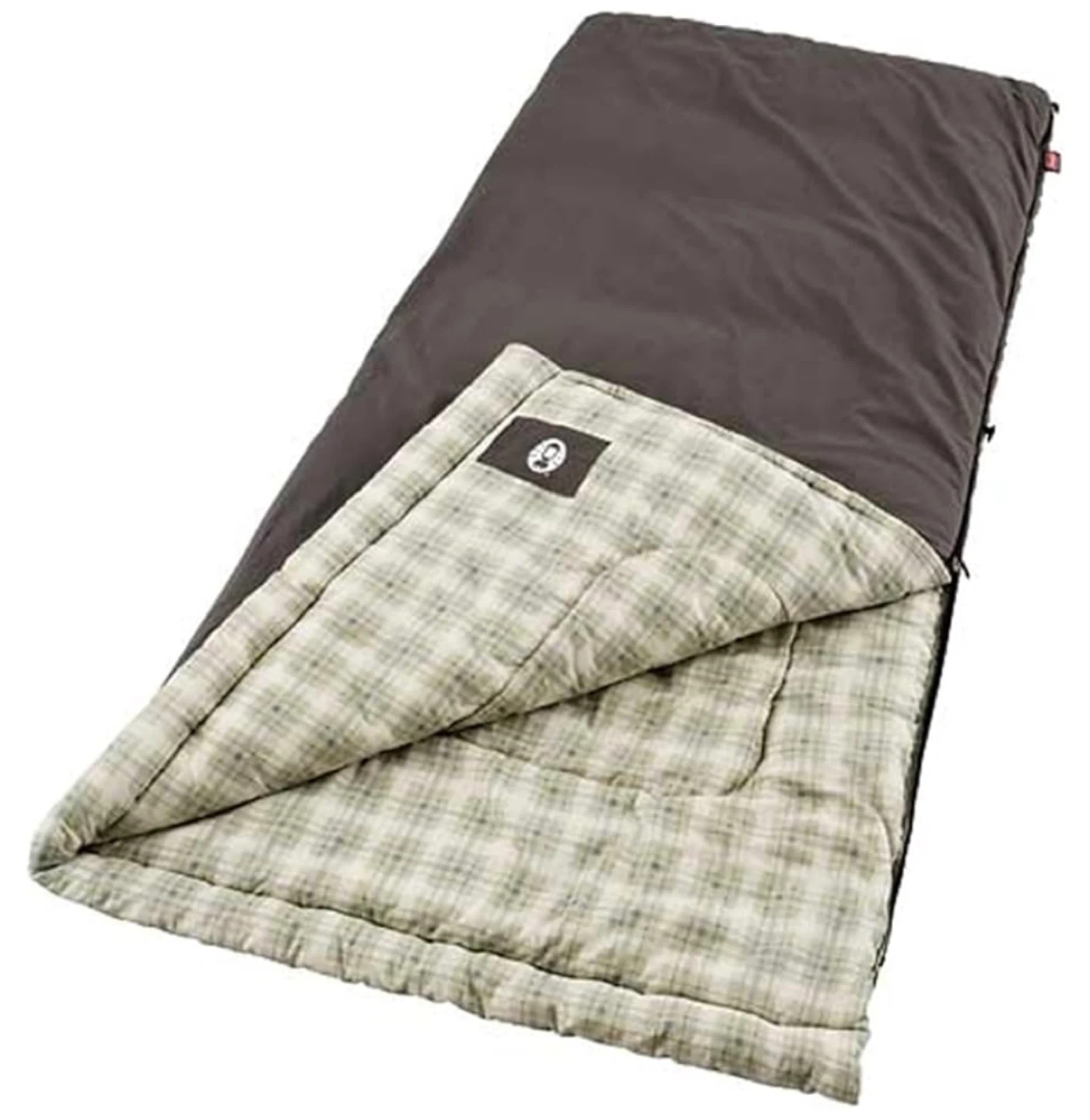 This is a Coleman sleeping bag with a plaid lining. It's a dark brown color on the outside. Perfect for camping trips or overnight stays! Coleman Heritage Big & Tall 10°F Flannel Sleeping Bag, XL