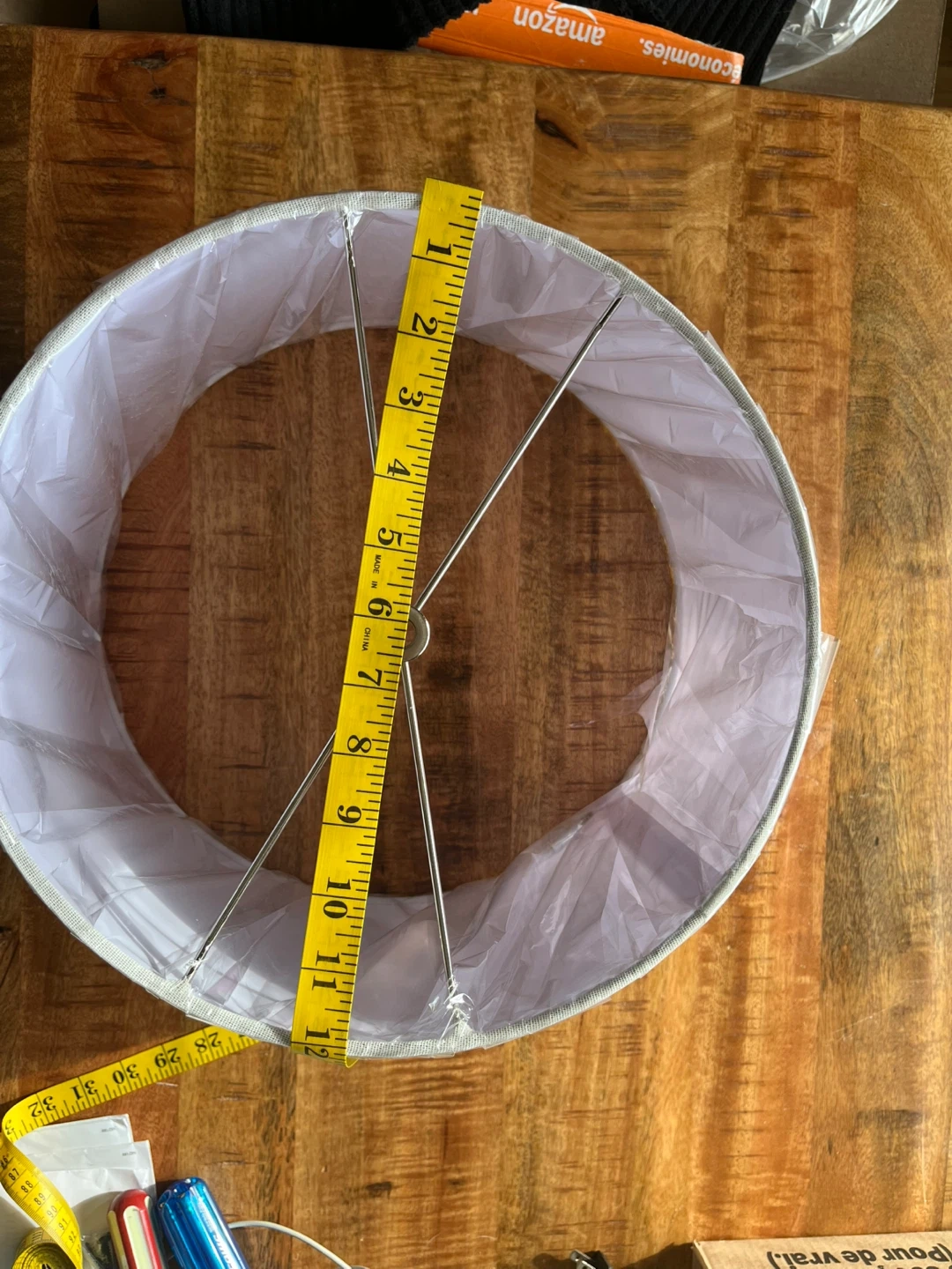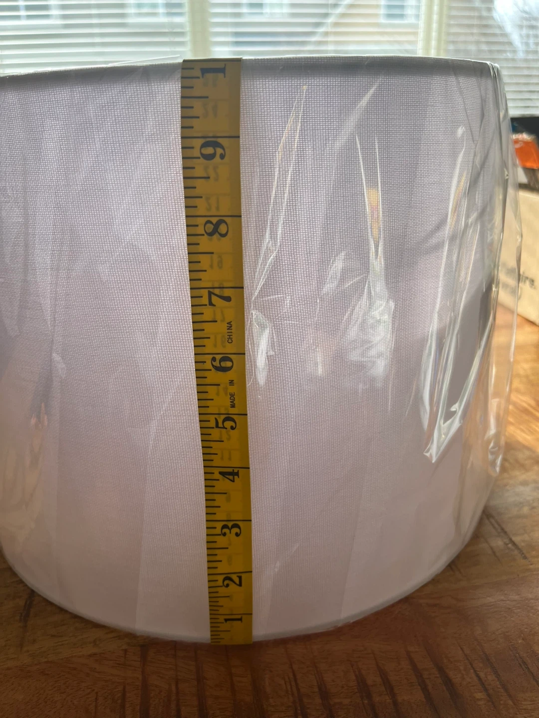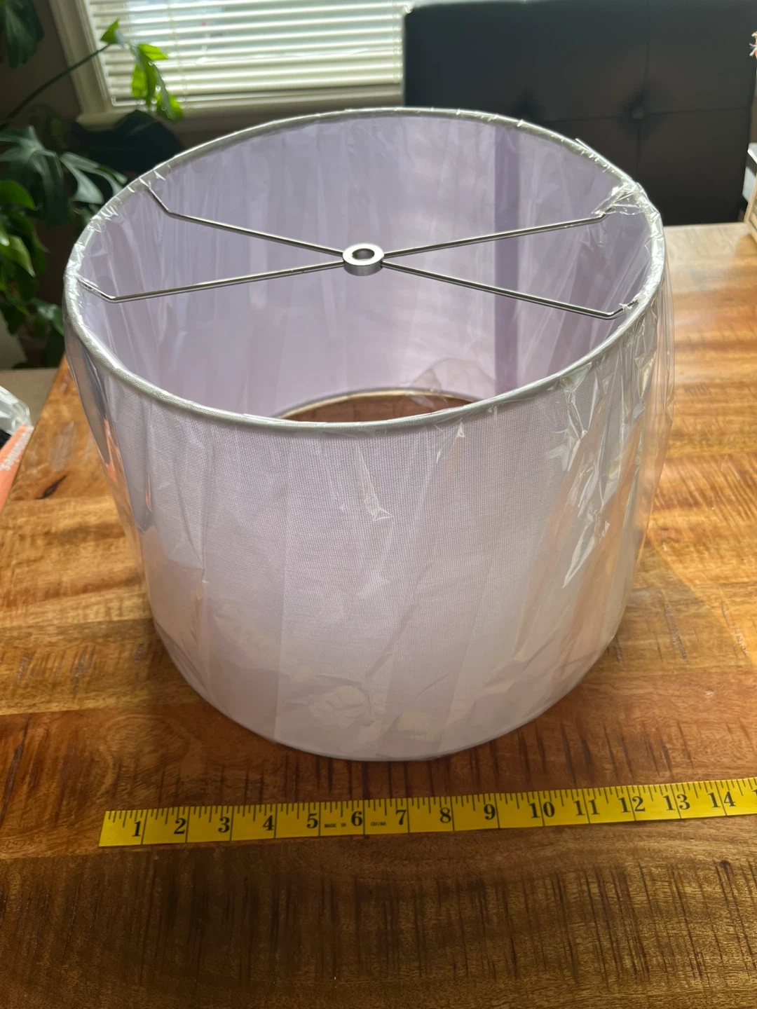 White fabric drum lamp shade with a metal frame. Measures 8 inches tall and 10 inches in diameter at the bottom. It's brand new and ready for a new lamp!