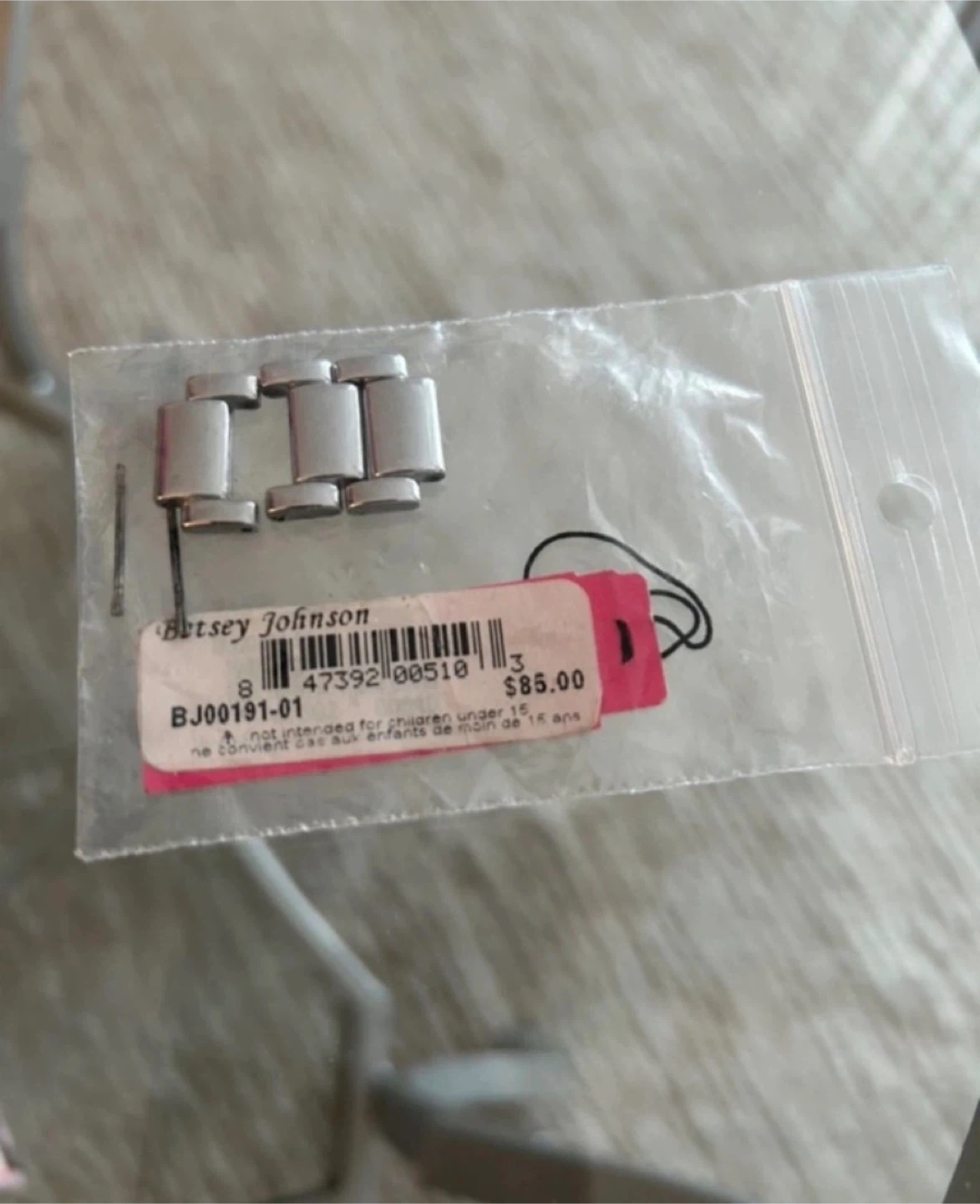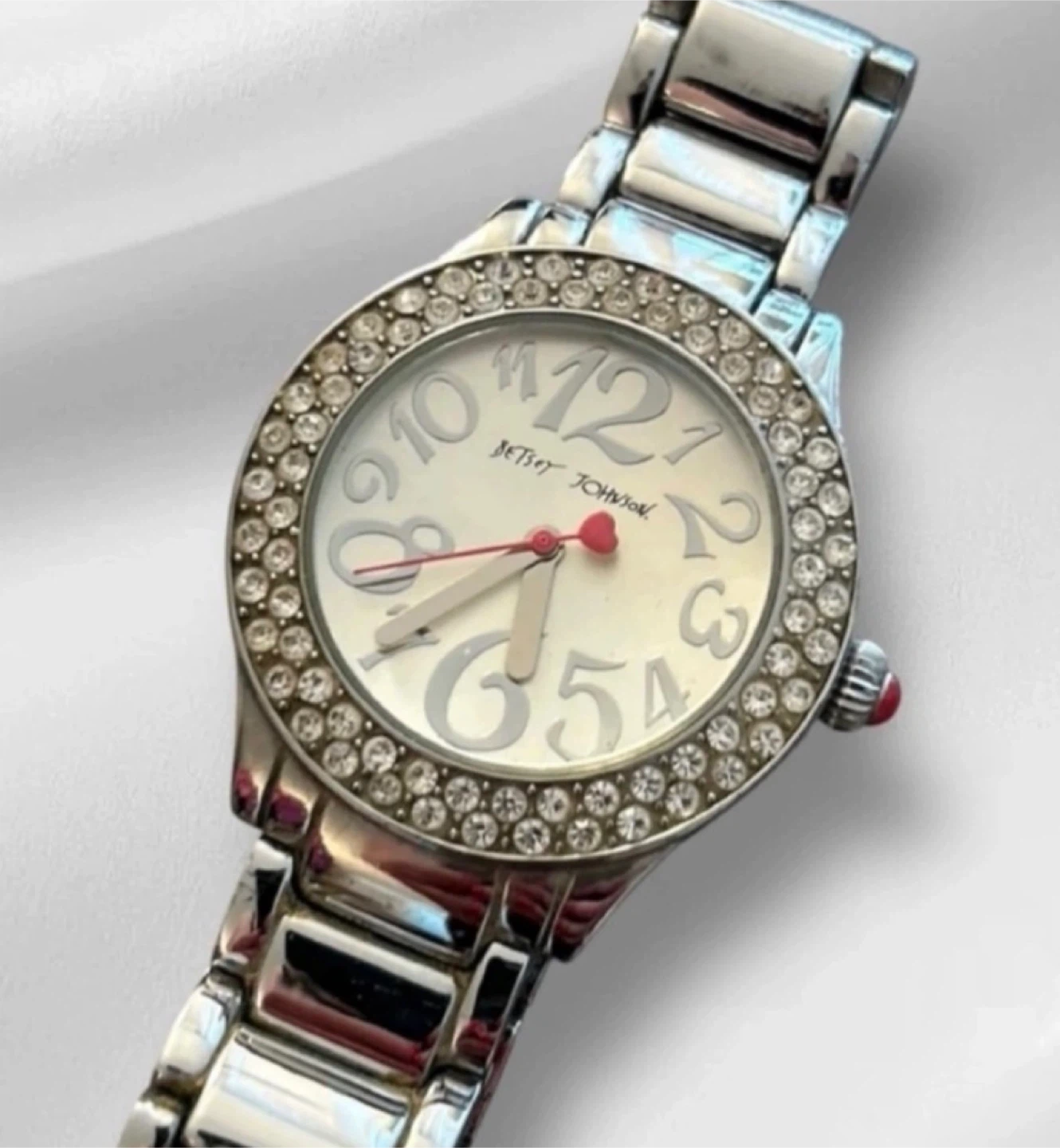 This Betsey Johnson watch features a silver-tone metal band and a white dial. It's adorned with a crystal-encrusted bezel and has large, easy-to-read numbers on the face. The second hand is a playful pink.