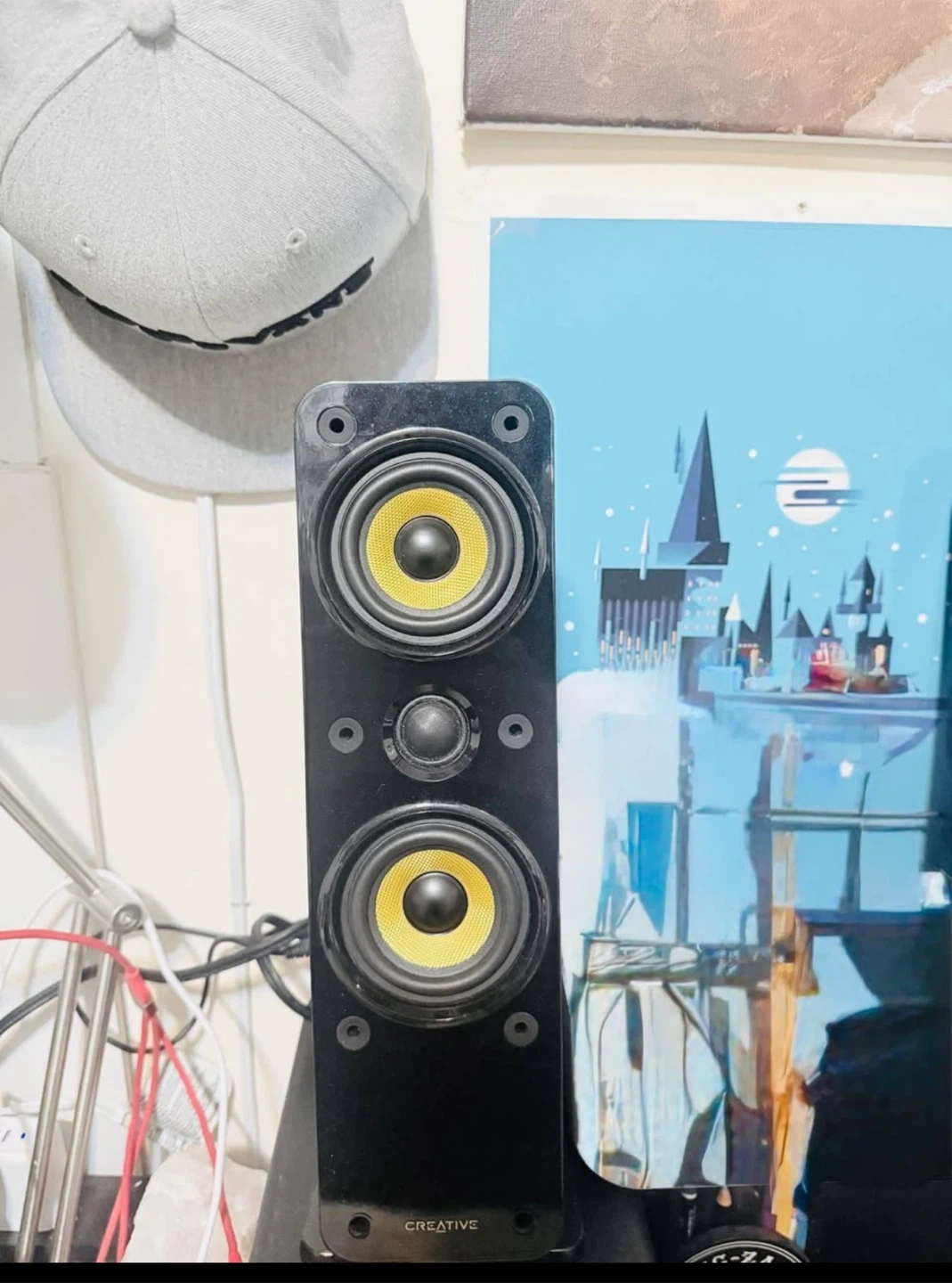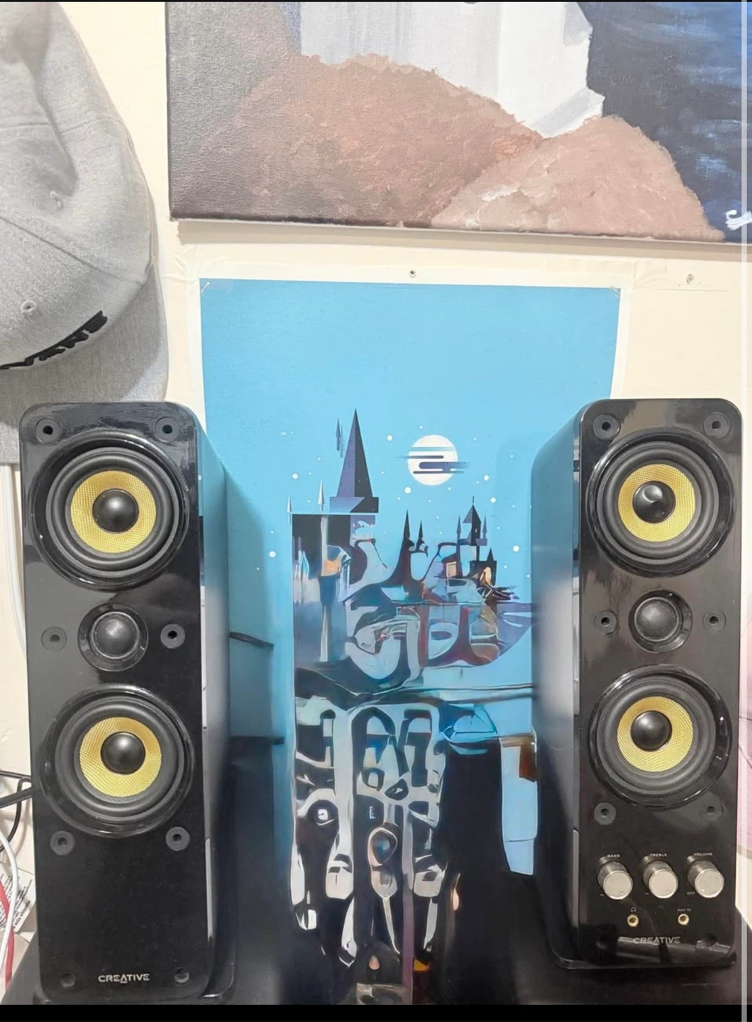 Selling a pair of Creative speakers. They are black with yellow accents and have a sleek design. Great for enhancing your audio experience!