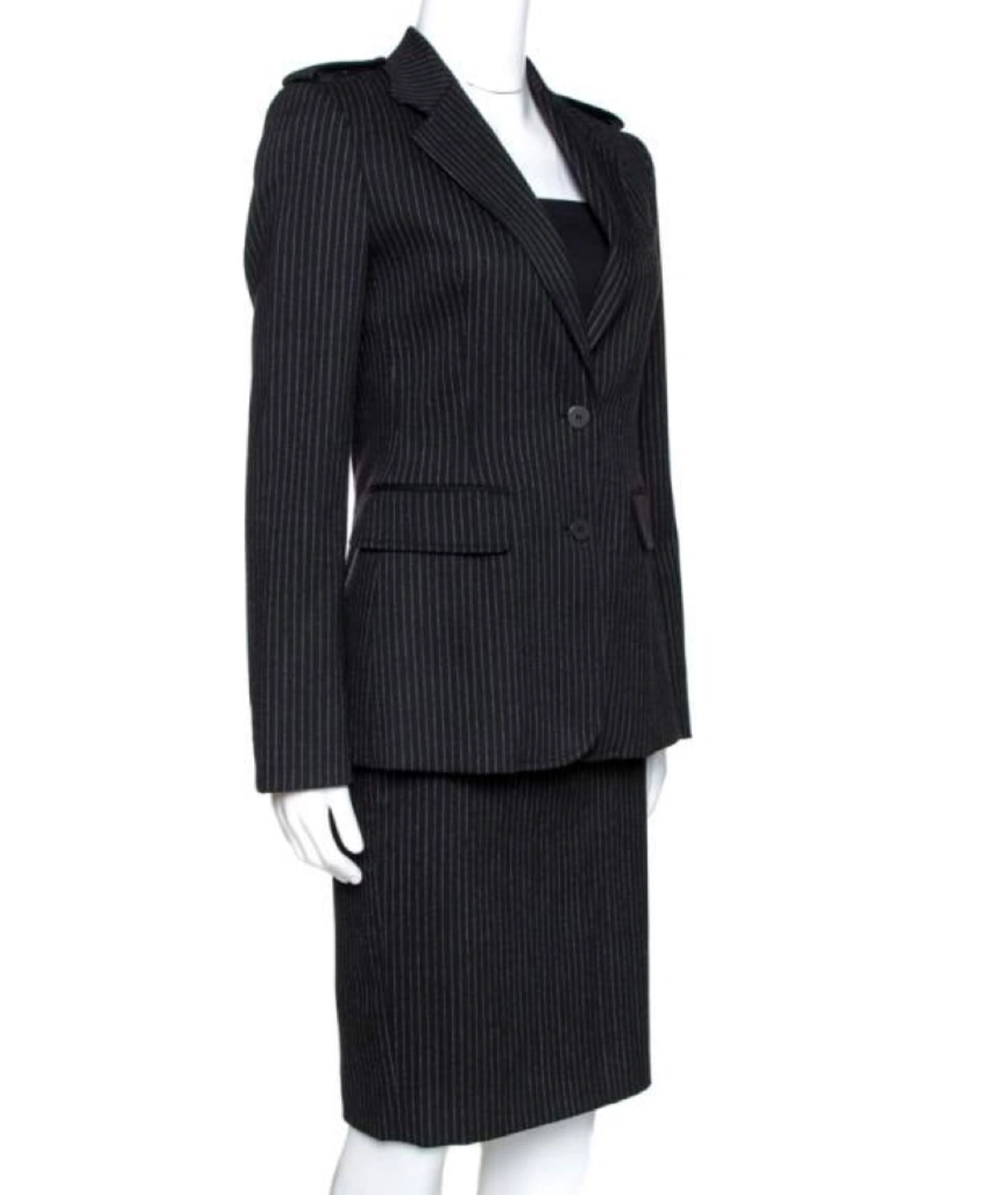 This stylish pinstripe dress & suit set features a blazer and matching dress, perfect for professional settings or a chic, tailored look. The material is comfortable and the pinstripe design adds a touch of sophistication. Size M.