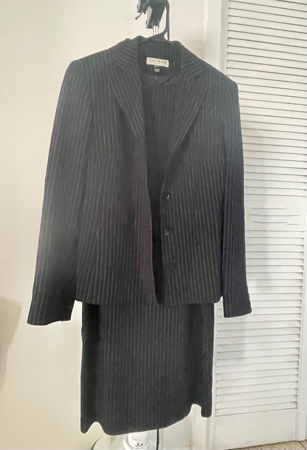 This stylish pinstripe dress & suit set features a blazer and matching dress, perfect for professional settings or a chic, tailored look. The material is comfortable and the pinstripe design adds a touch of sophistication. Size M.