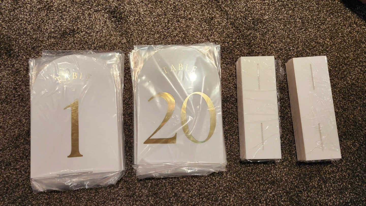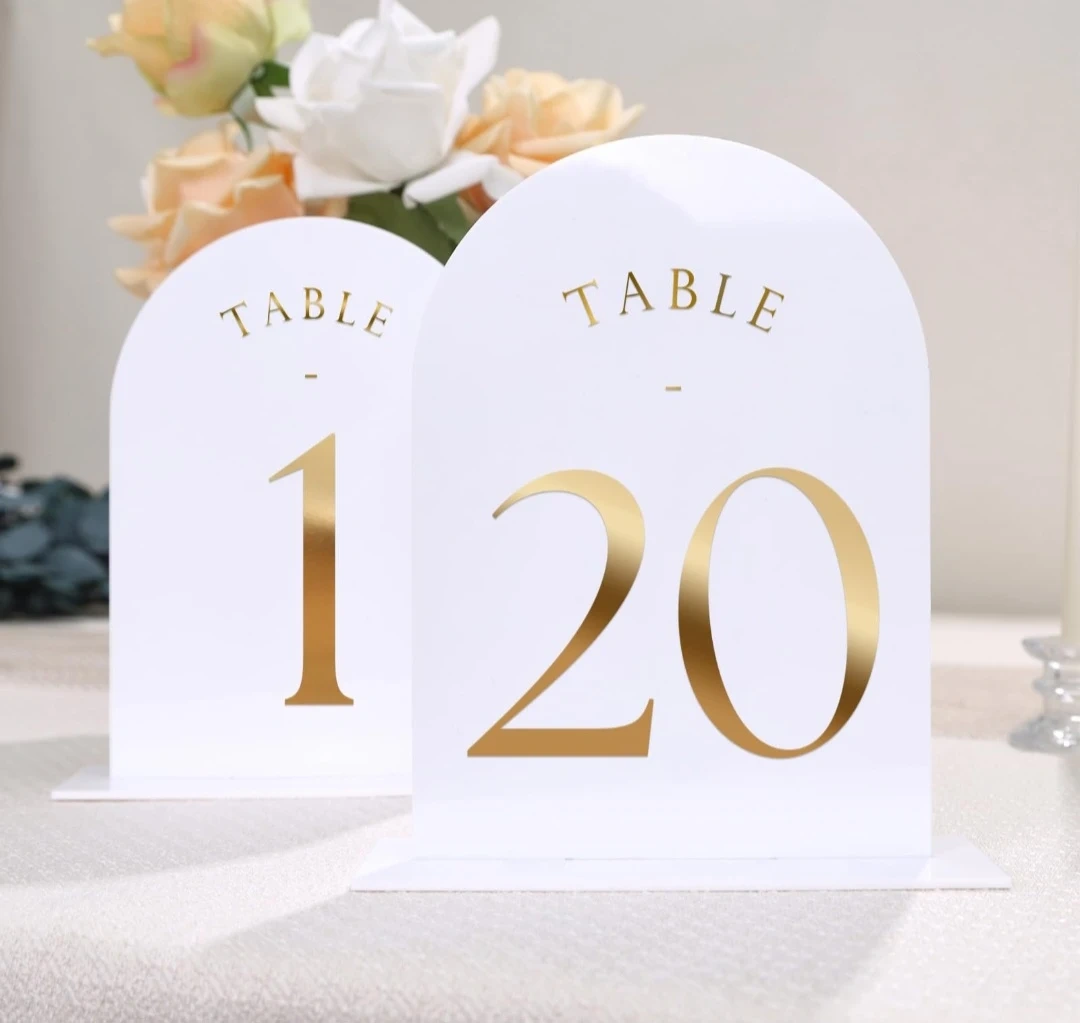 These modern arched table numbers are made from durable white acrylic with elegant gold foil numbering. They measure 5 inches wide by 7 inches tall, providing clear visibility for guests. Perfect for weddings, parties, and events to help guide seating arrangements.