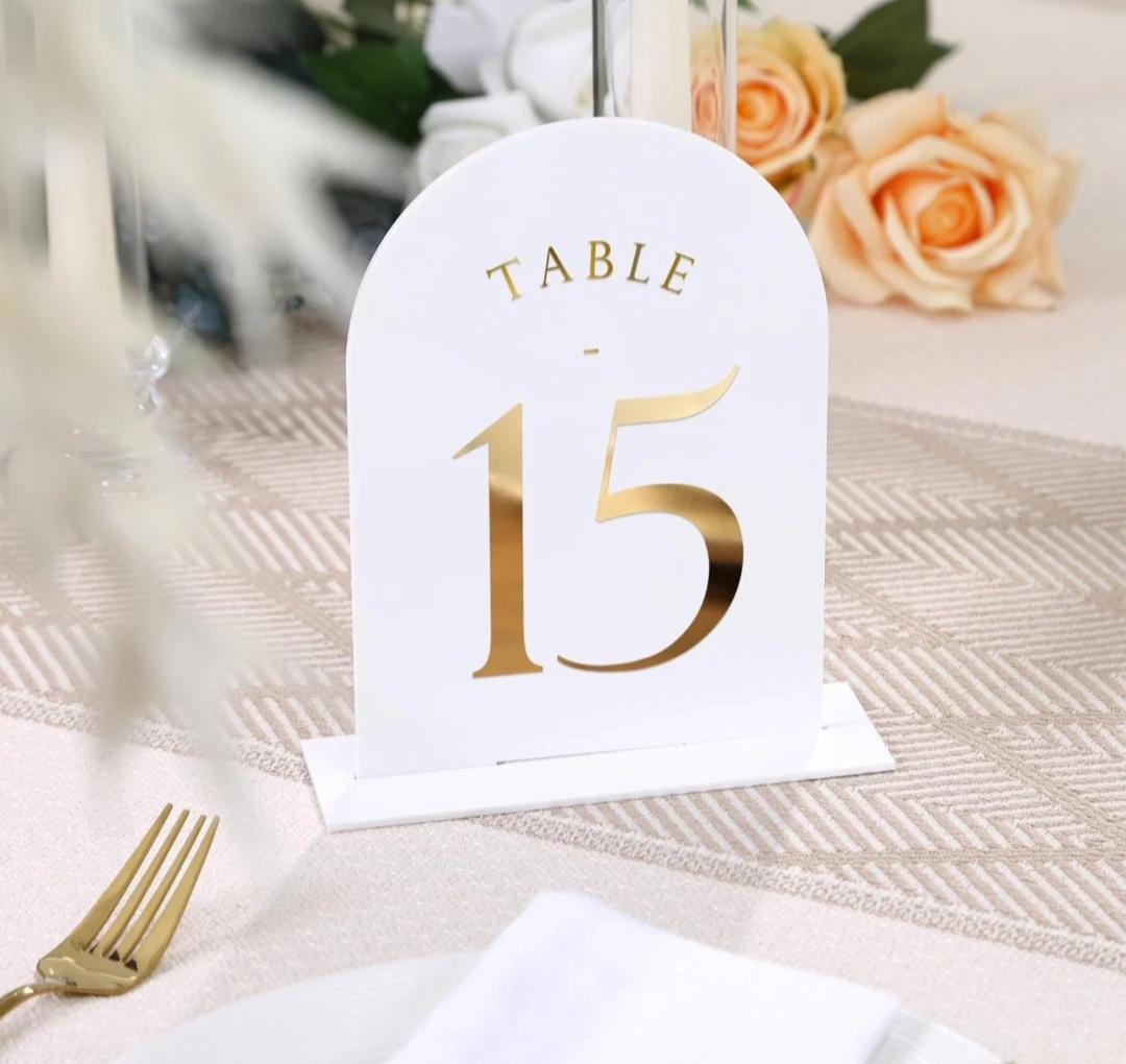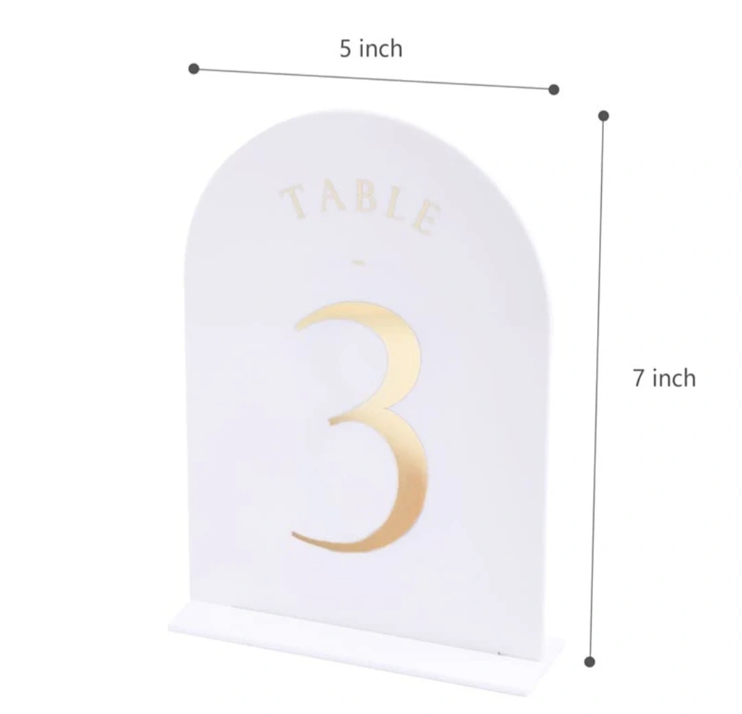 These modern arched table numbers are made from durable white acrylic with elegant gold foil numbering. They measure 5 inches wide by 7 inches tall, providing clear visibility for guests. Perfect for weddings, parties, and events to help guide seating arrangements.