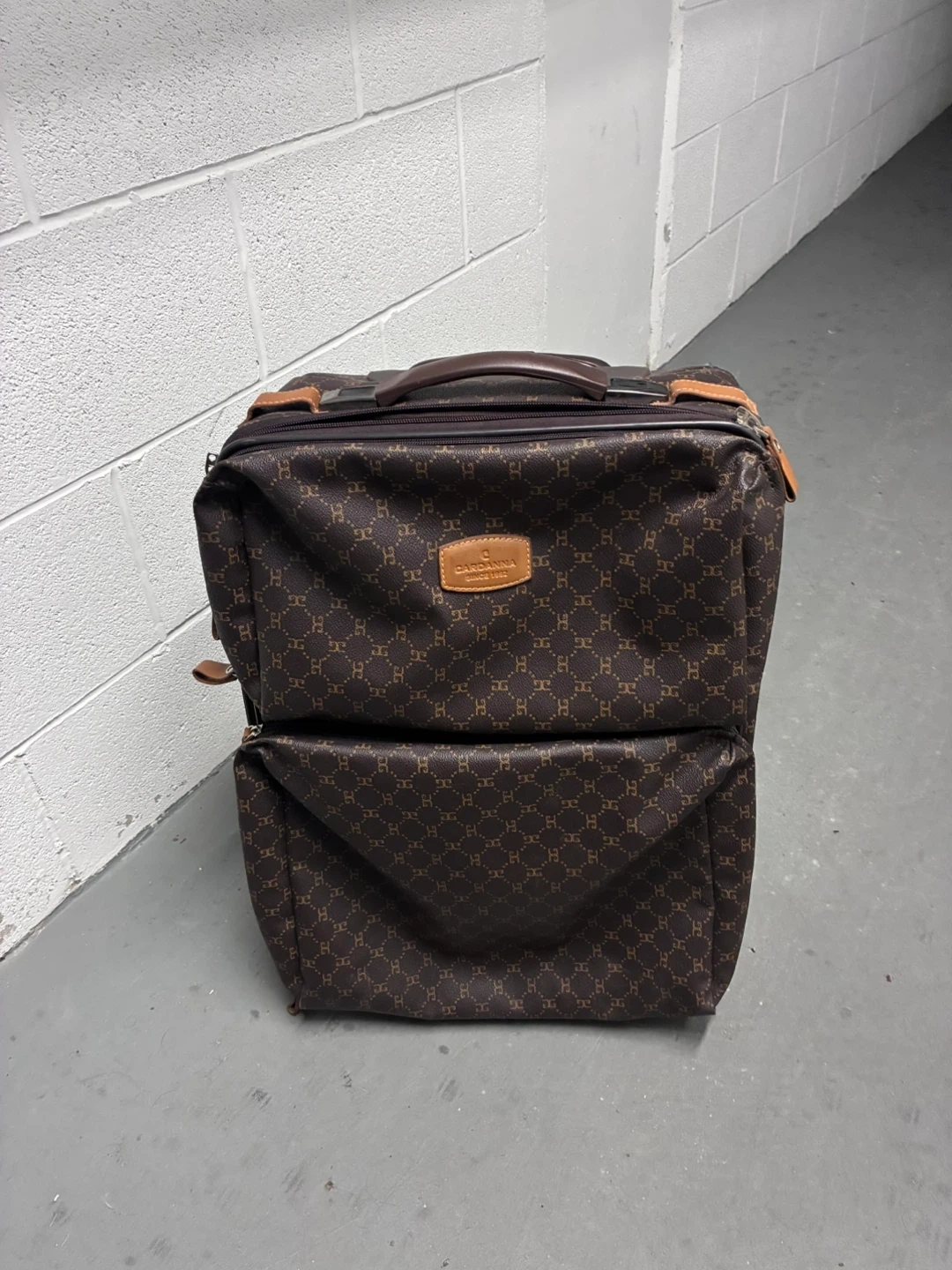 This is a CARDANNA rolling suitcase with a brown monogram pattern. It features a retractable handle and has two main zippered compartments. It's a great size for weekend trips or carry-on luggage!