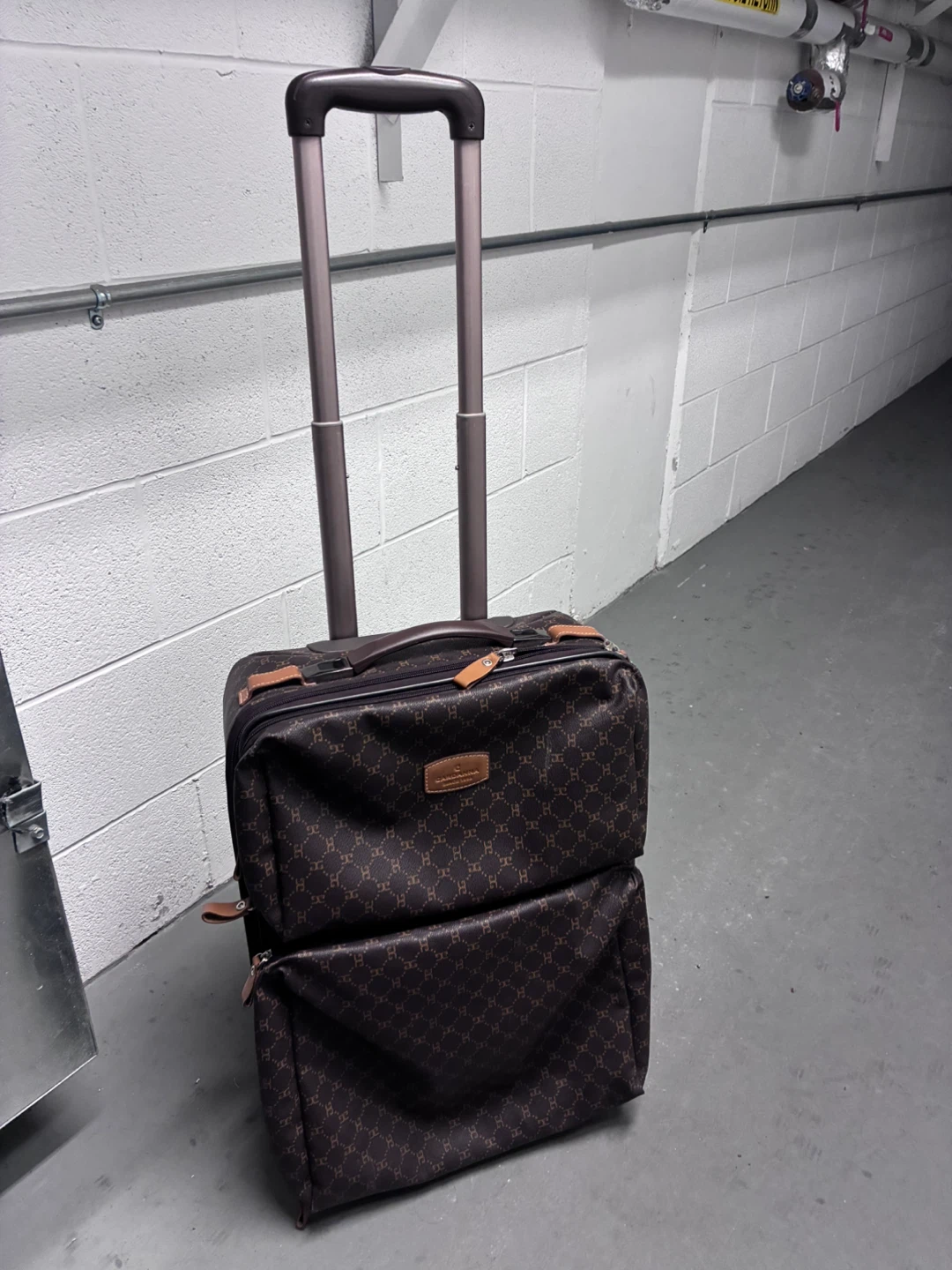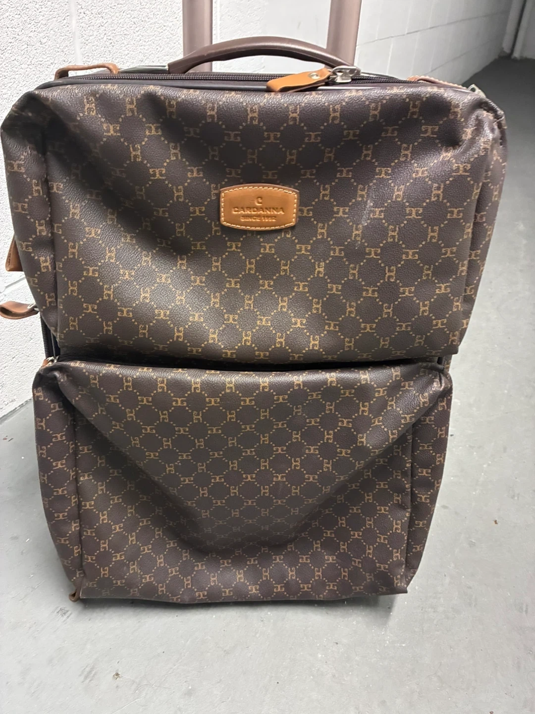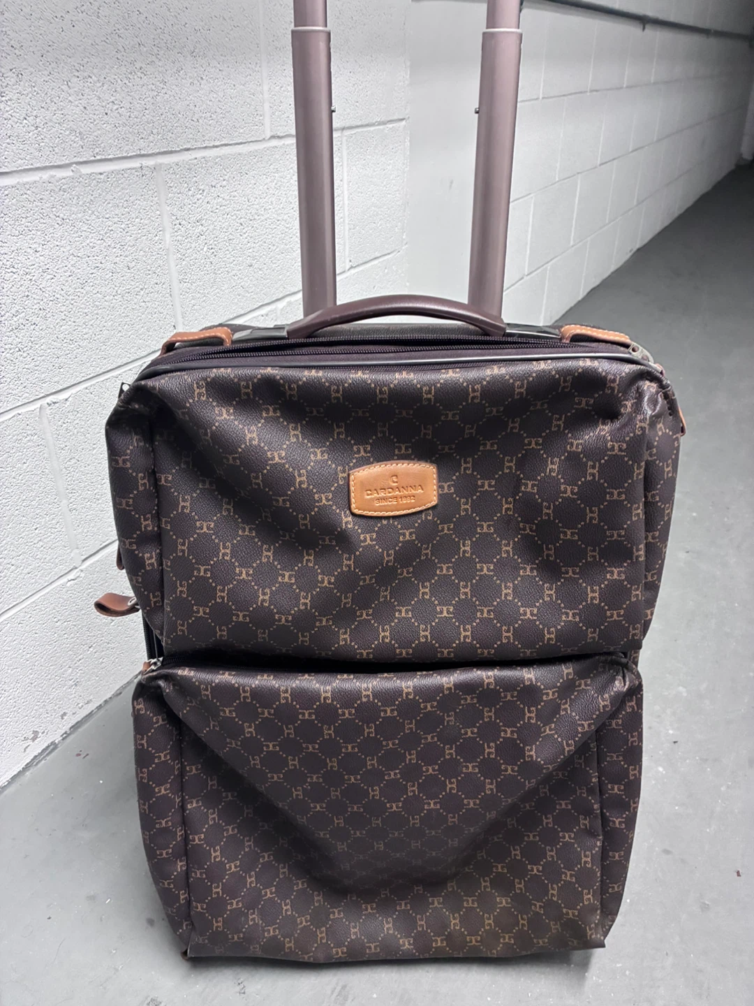 This is a CARDANNA rolling suitcase with a brown monogram pattern. It features a retractable handle and has two main zippered compartments. It's a great size for weekend trips or carry-on luggage!