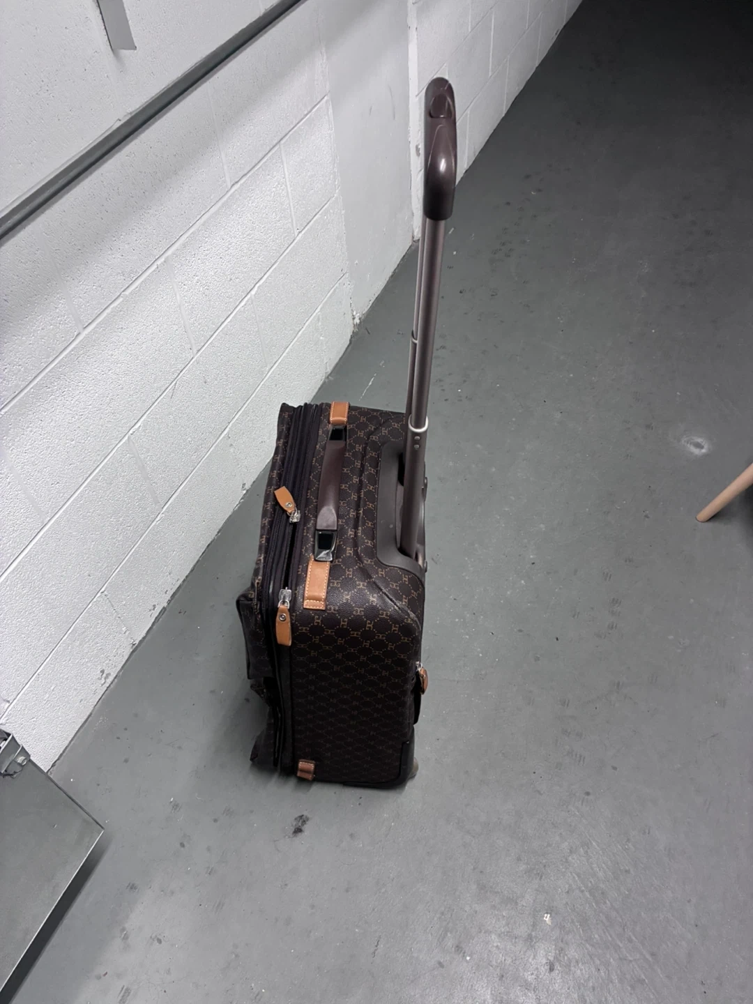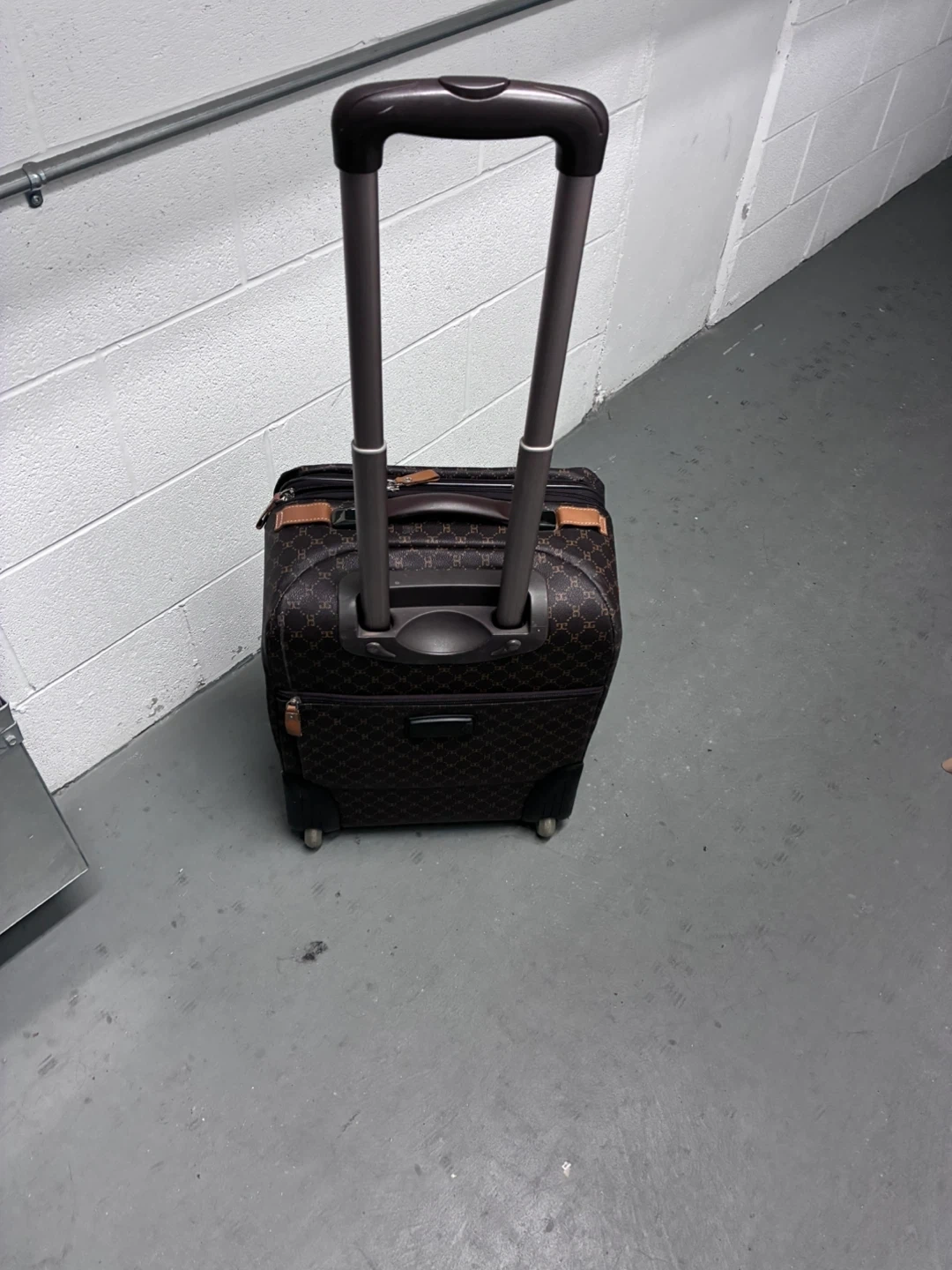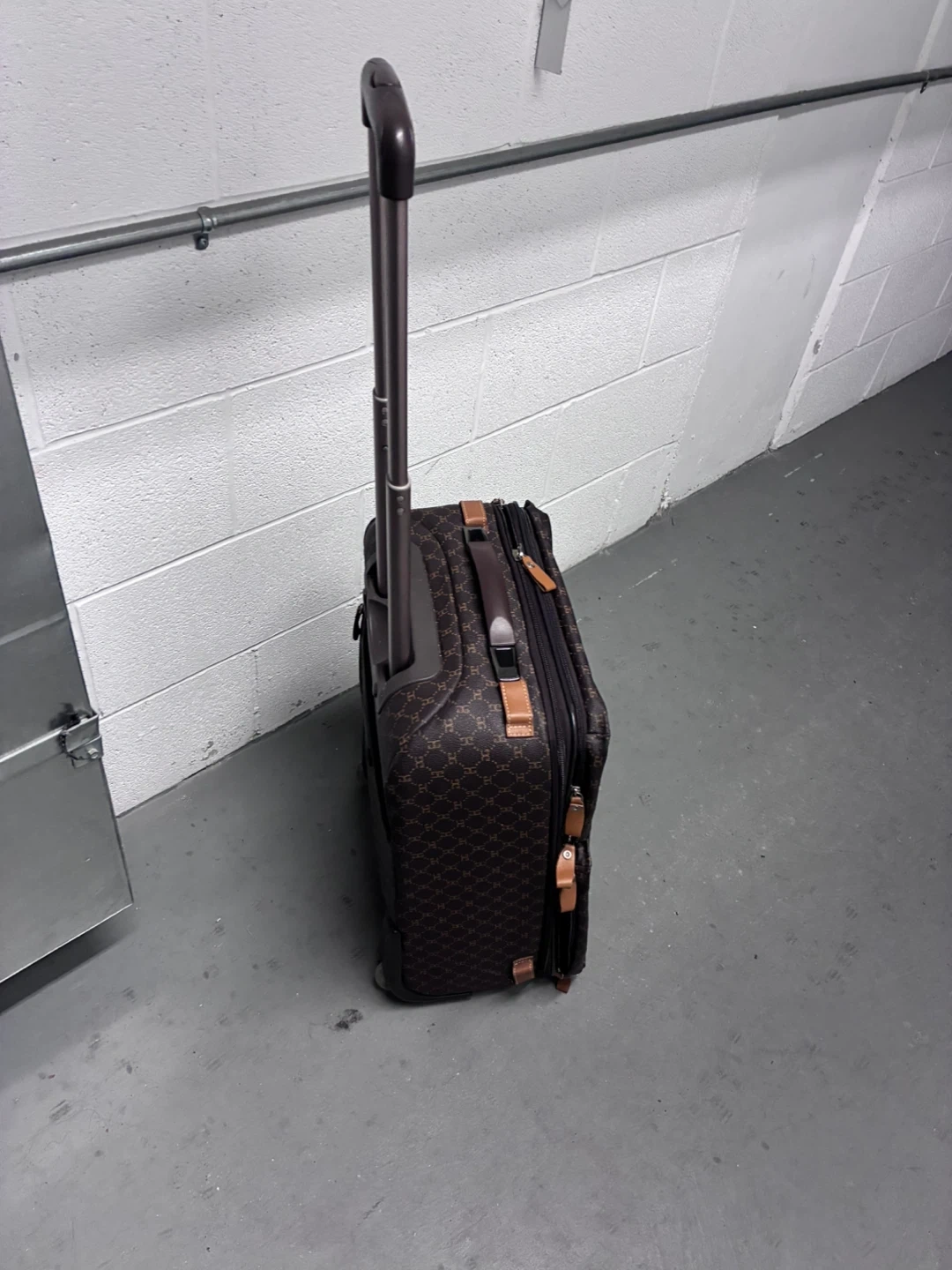 This is a CARDANNA rolling suitcase with a brown monogram pattern. It features a retractable handle and has two main zippered compartments. It's a great size for weekend trips or carry-on luggage!