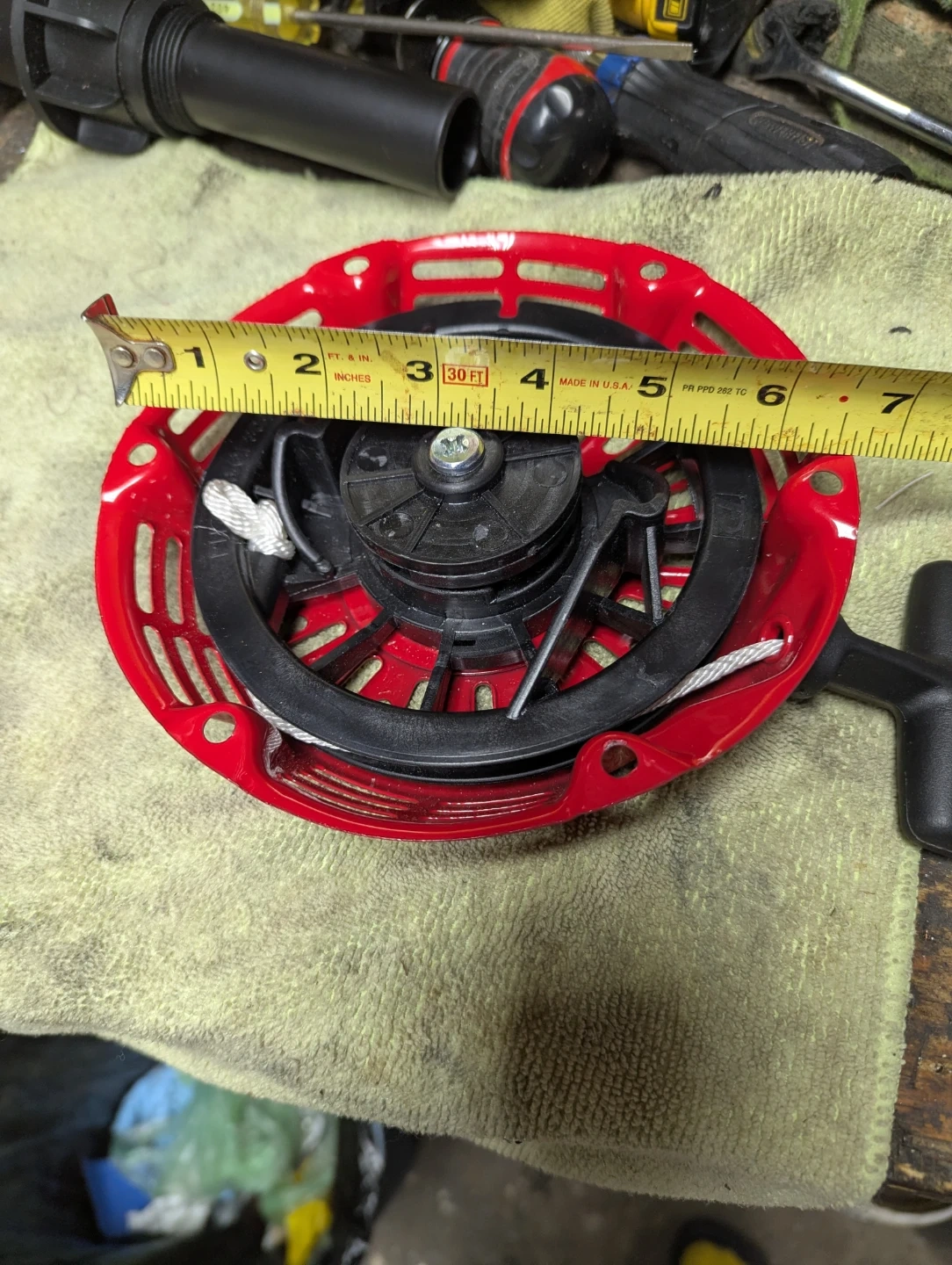 Red recoil starter assembly with black handle and pull cord. It measures approximately 7 inches in diameter. This part is commonly used for small engine equipment.