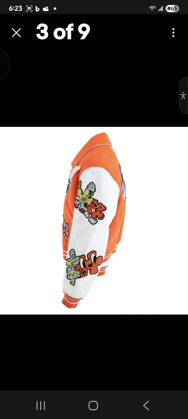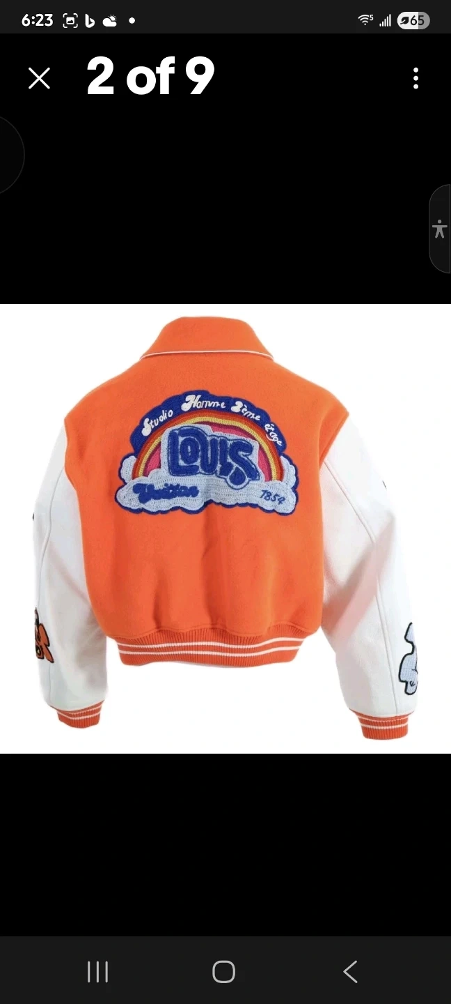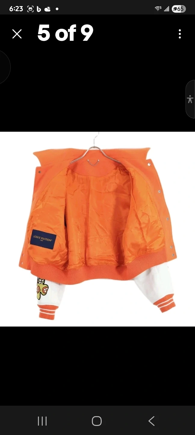 This is a Louis Vuitton varsity jacket in orange and white. It features embroidered patches and a classic collegiate design. The interior lining is bright orange.