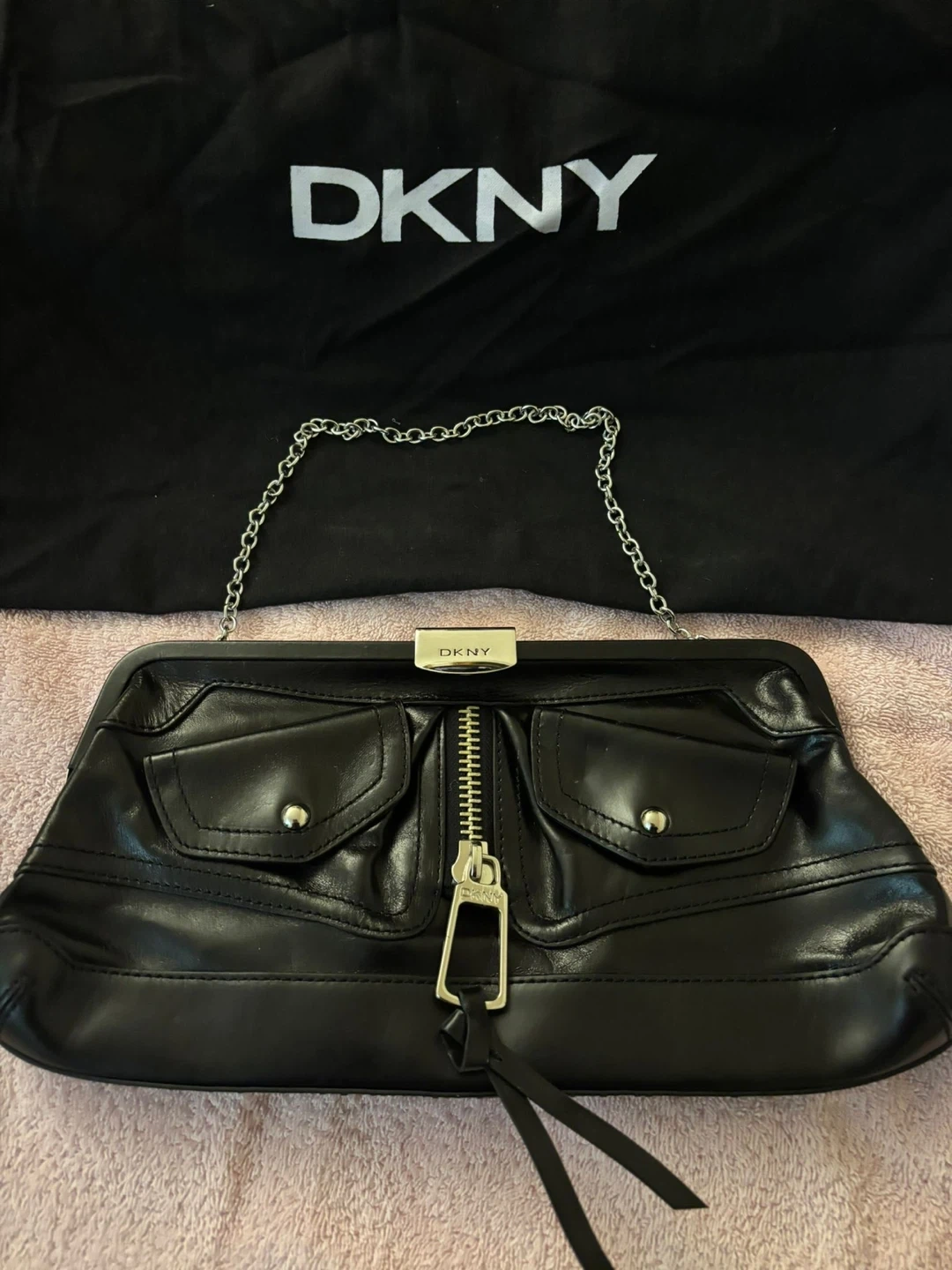 This is a black leather clutch from DKNY. It features a silver zipper closure and a detachable silver chain strap. It's a stylish accessory for various occasions!