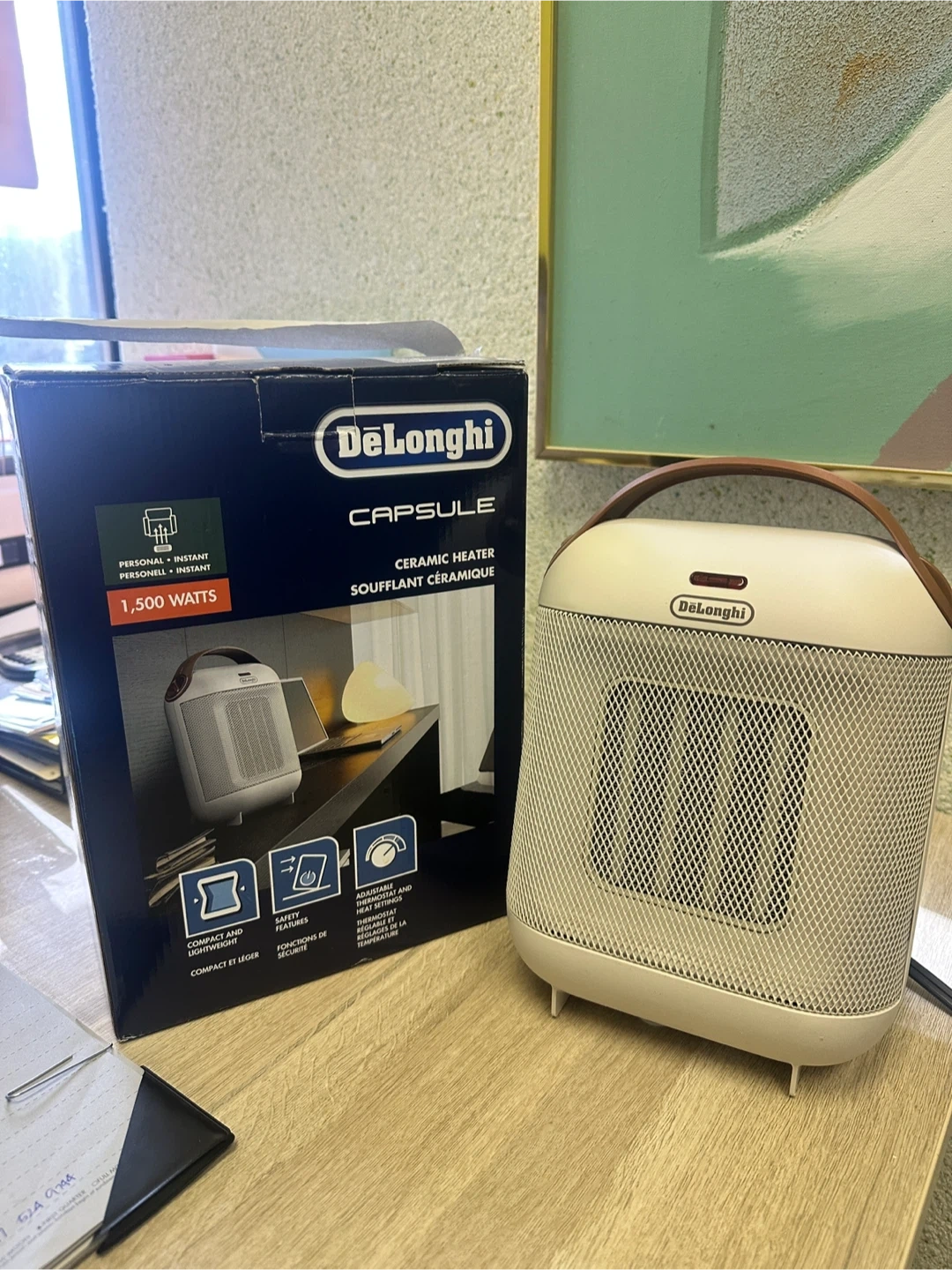 Selling a De'Longhi Capsule ceramic heater (1500W) and a compact desk fan. Both in great working condition. Perfect for staying warm in winter and cool in summer.
