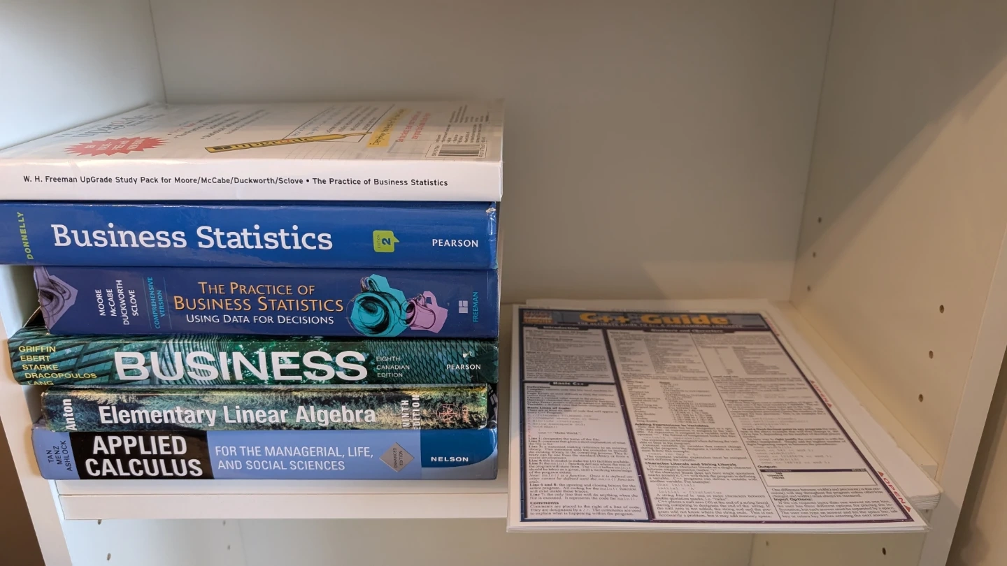 Bundle of five university-level textbooks. Includes two Business Statistics texts, one General Business text, Applied Calculus, and Elementary Linear Algebra. All books appear to be in good condition for study.