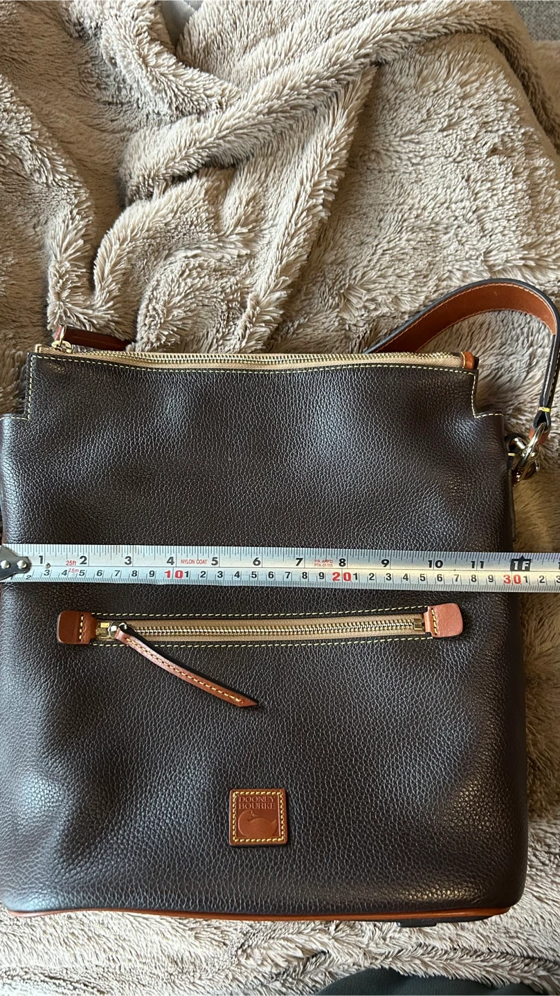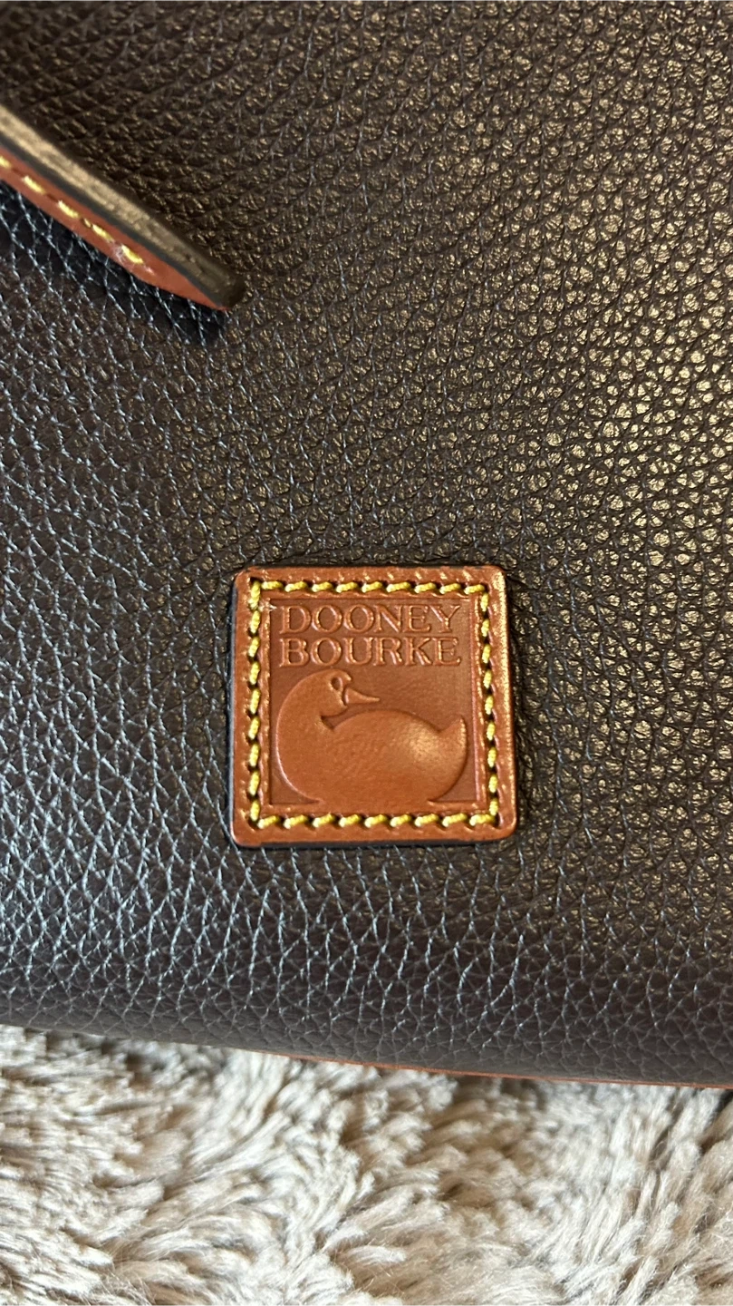 Medium sized Dooney & Bourke shoulder bag made of pebbled grain leather. It has multiple interior pockets and a zip-top closure. The bag has comfortable leather shoulder straps and durable hardware. Excellent condition