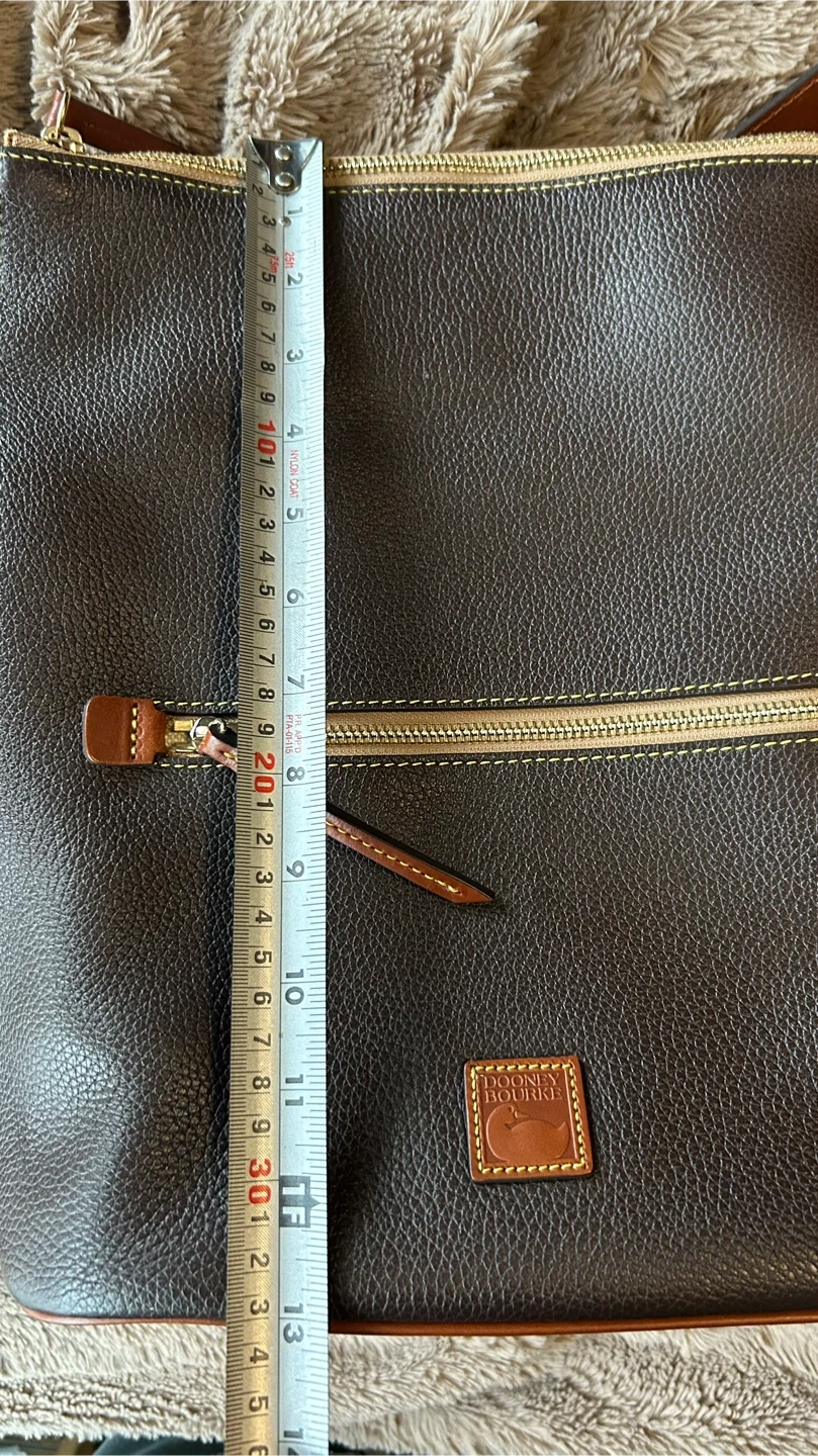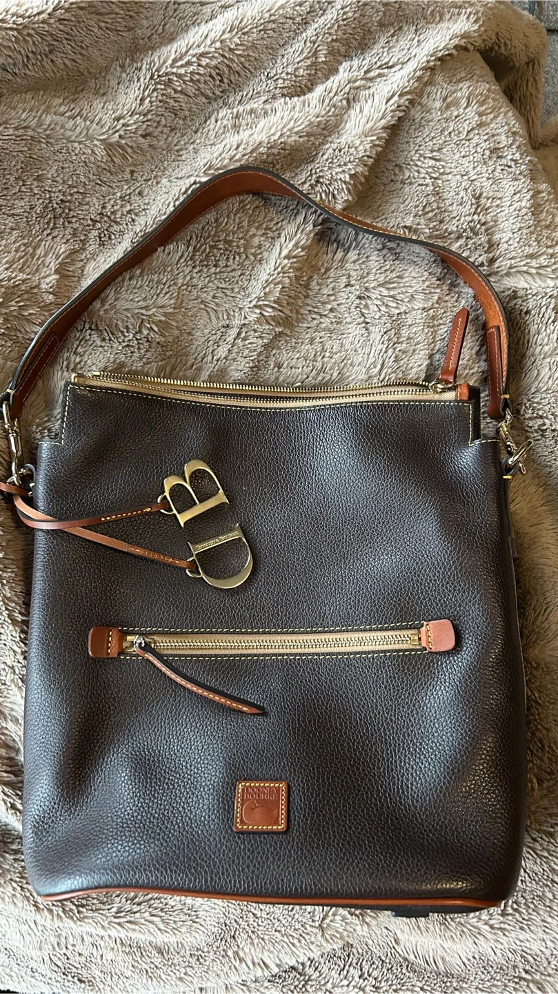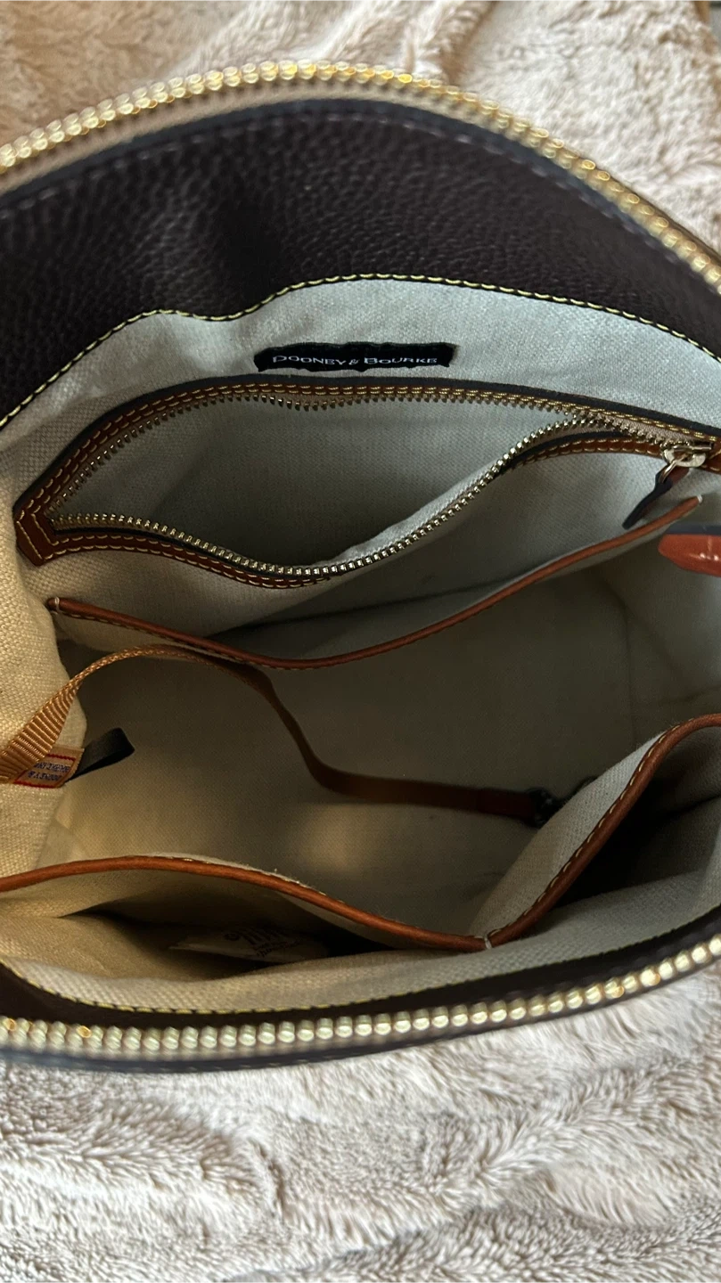 Medium sized Dooney & Bourke shoulder bag made of pebbled grain leather. It has multiple interior pockets and a zip-top closure. The bag has comfortable leather shoulder straps and durable hardware. Excellent condition