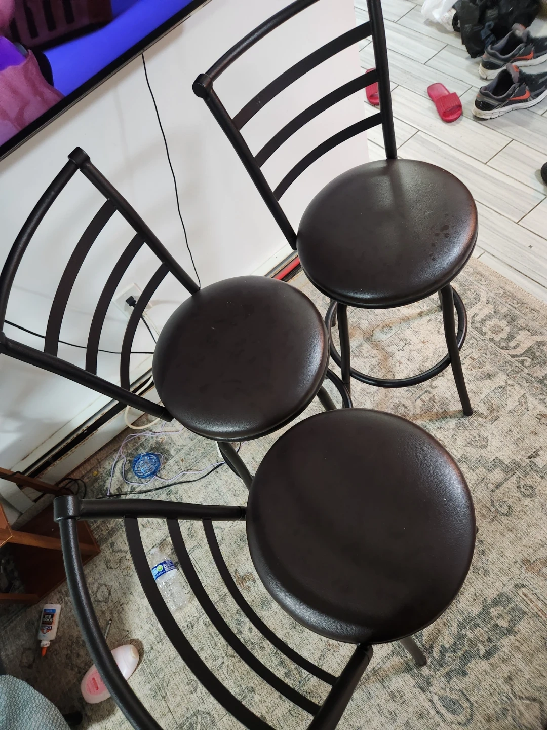 These are three dark brown, round bar stools. They're made of metal with faux leather seats. Perfect for a kitchen counter or home bar!