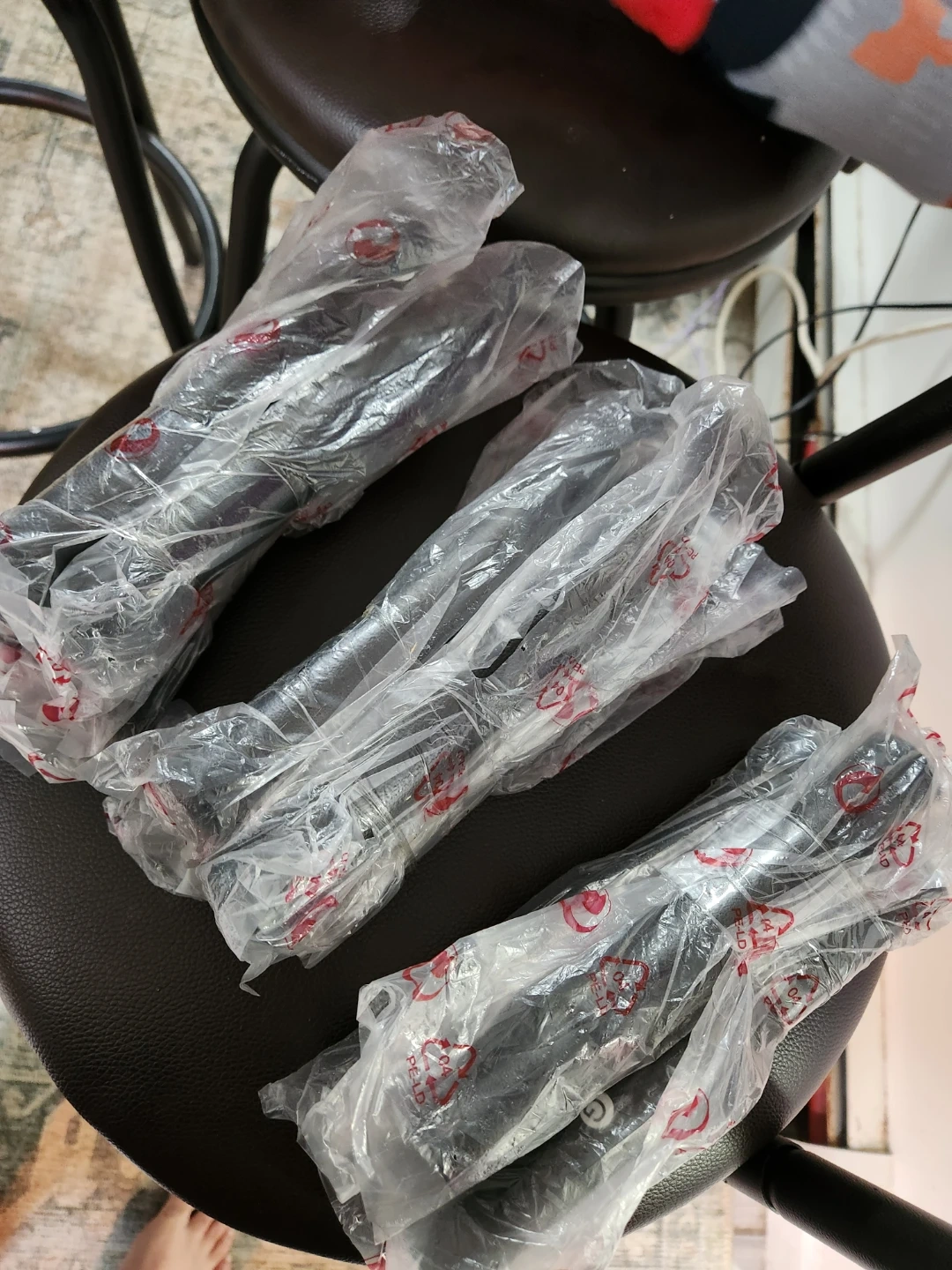 These are three dark brown, round bar stools. They're made of metal with faux leather seats. Perfect for a kitchen counter or home bar!