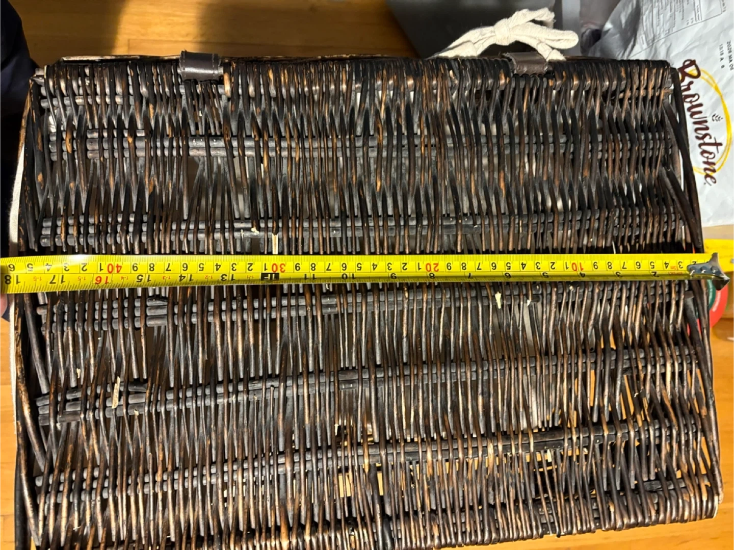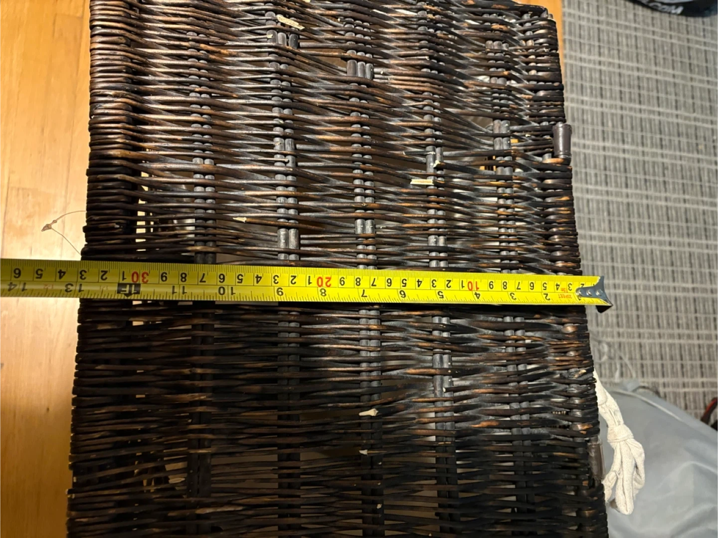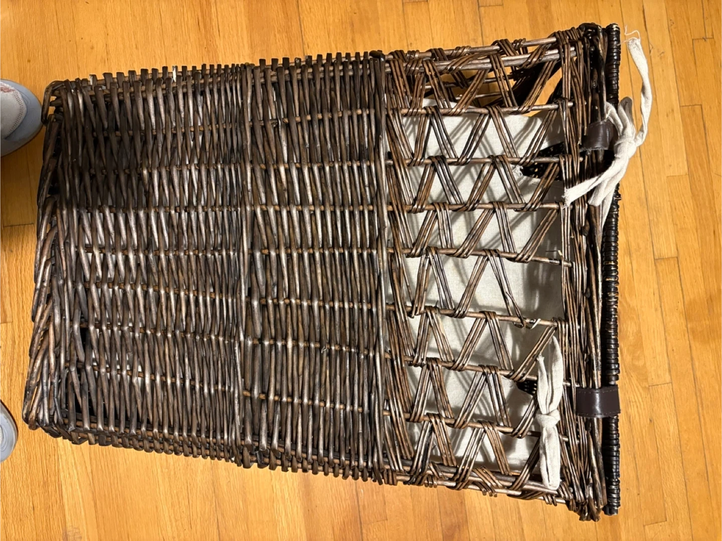 Dark brown wicker laundry hamper with a light-coloured linen liner. It's great for keeping laundry tidy. The hamper measures approximately 20 inches long and 15 inches wide. Use it in the bedroom or bathroom to store clothes.pickup at Morley trail NW