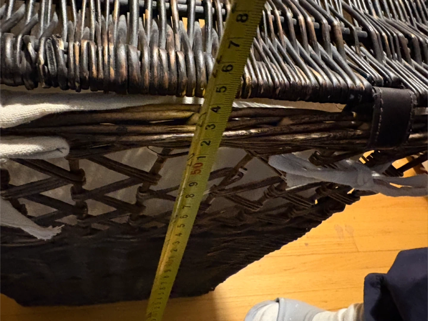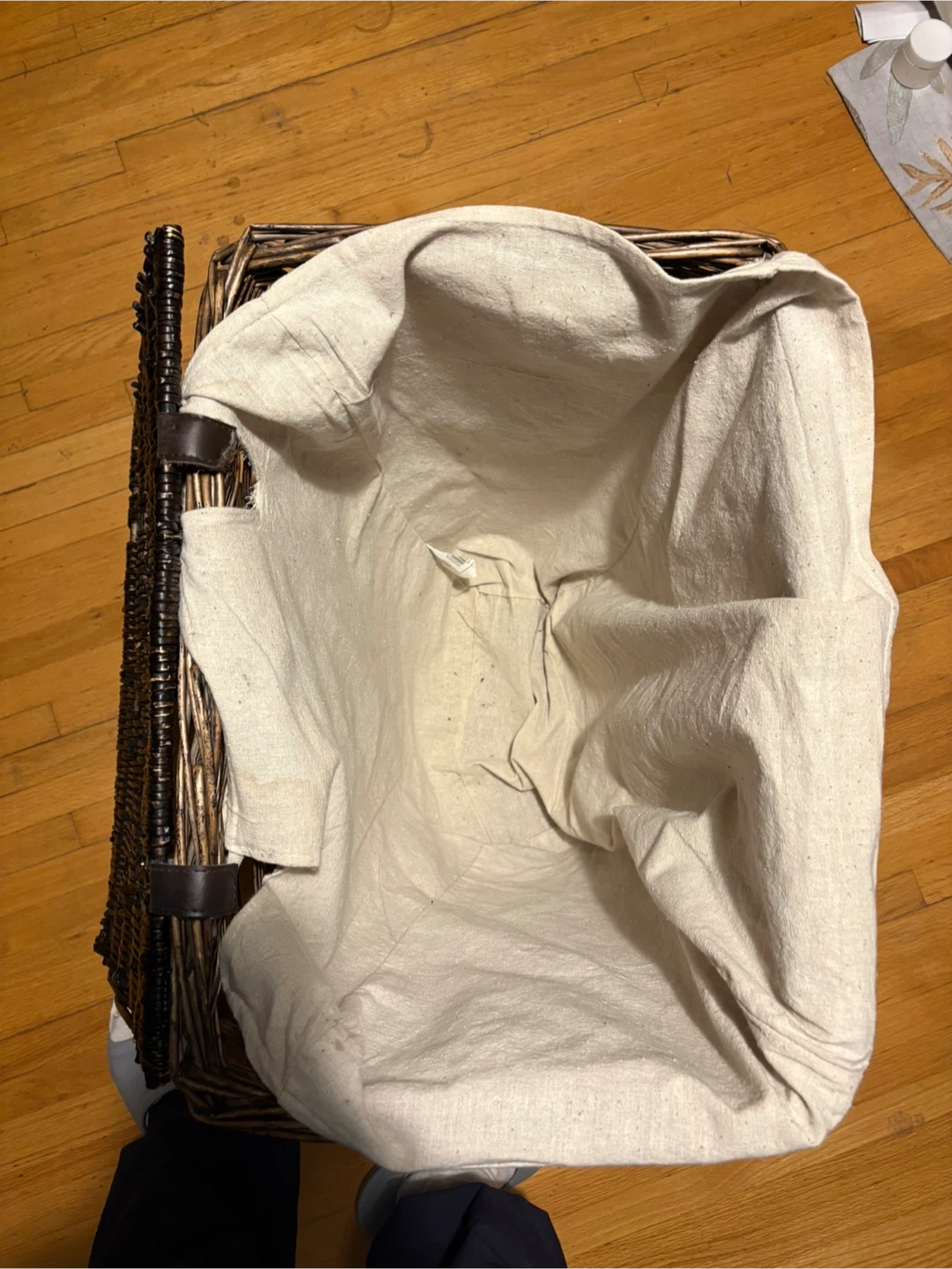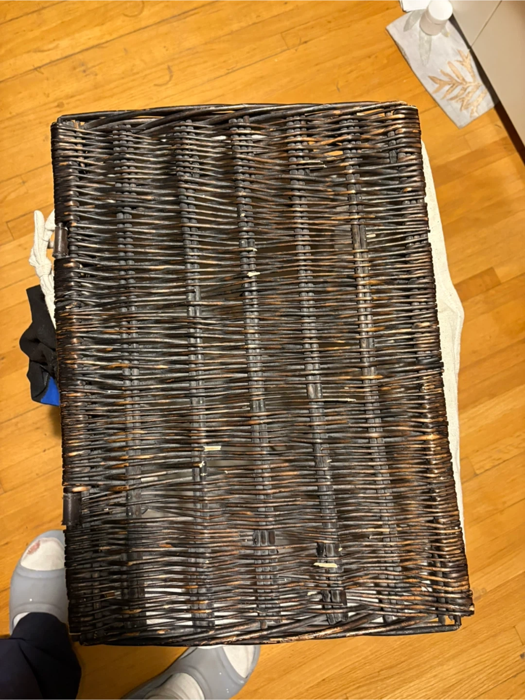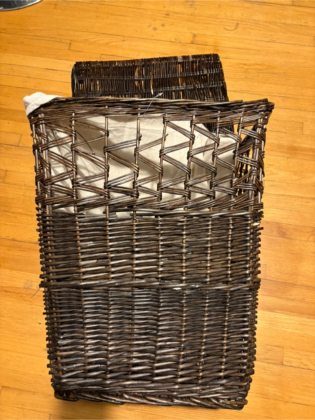 Dark brown wicker laundry hamper with a light-coloured linen liner. It's great for keeping laundry tidy. The hamper measures approximately 20 inches long and 15 inches wide. Use it in the bedroom or bathroom to store clothes.pickup at Morley trail NW