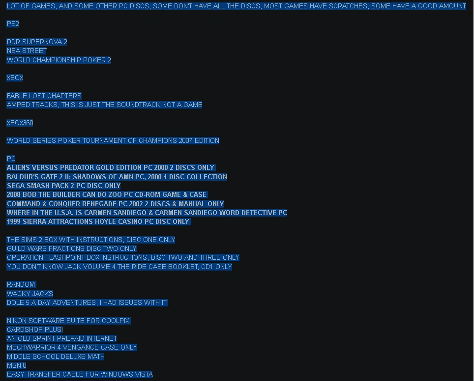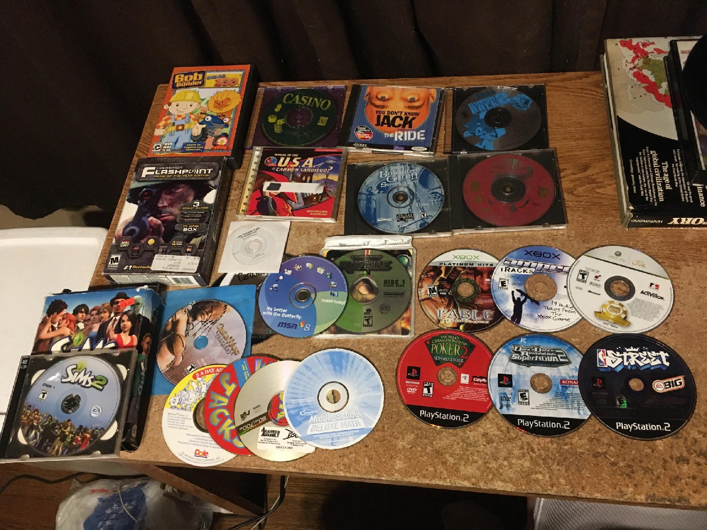 Collection of various game discs. There are several Playstation 2 games and some Xbox games. Some game cases are included as well. Relax and unwind with some of your favorite games. some of the discs have a lot of scratches not all the PC and Xbox games have been tested some of the PC games don't have all the discs has baldurs gate 2 where in the world is Carmen sandiego The Sims Bob the builder Sega mega pack 2 alien vs predator pick up at house