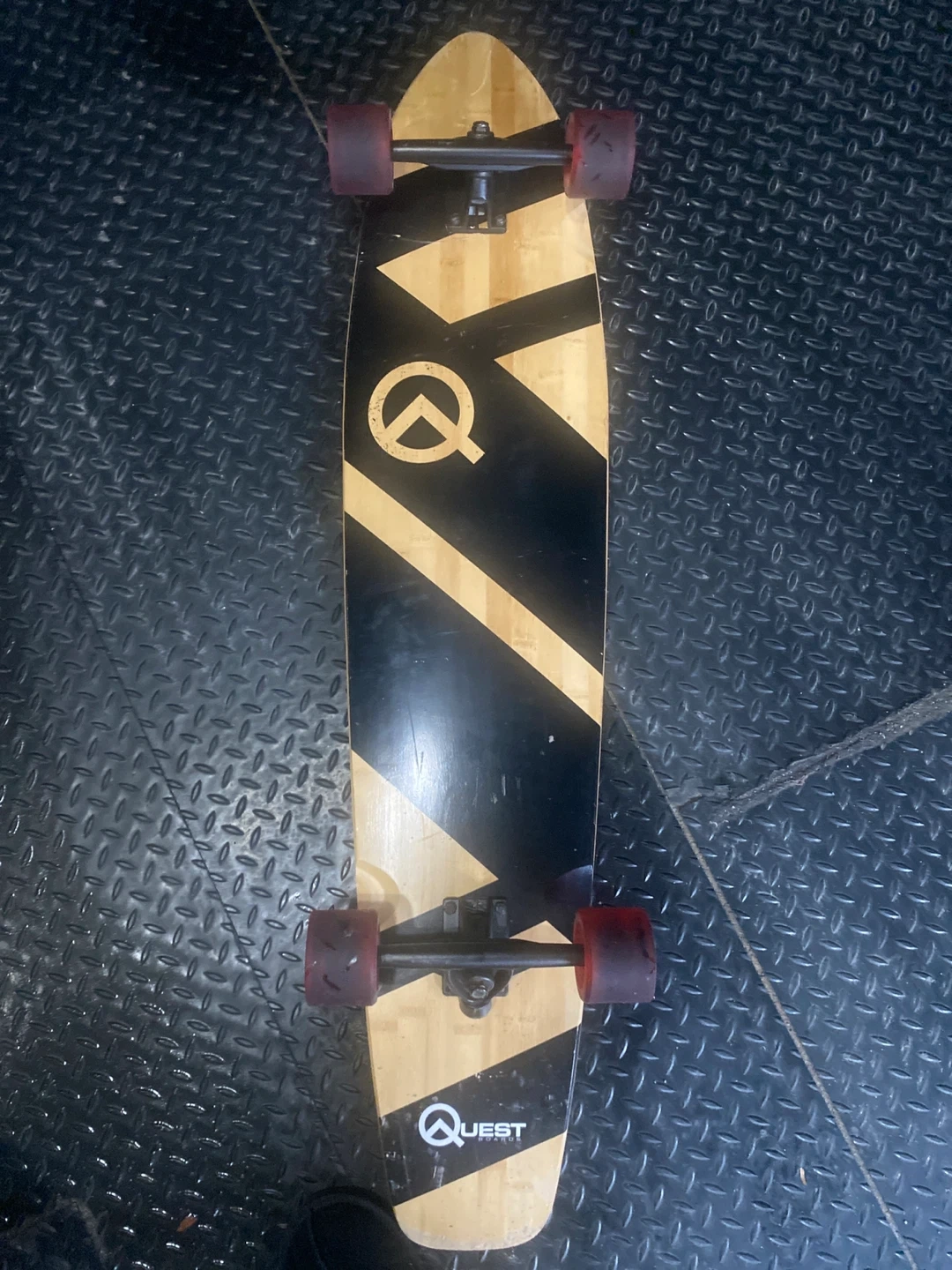 This is a Quest longboard skateboard. It's a good board for cruising around. The deck is made of wood with a cool black and tan stripe design. Red wheels included.