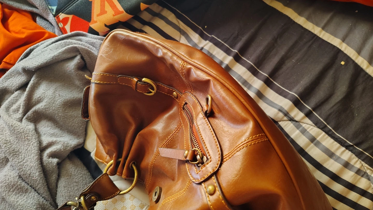 This is a classic brown leather shoulder bag. It's crafted from genuine leather with brass hardware. Features a zippered main compartment and an exterior zip pocket.