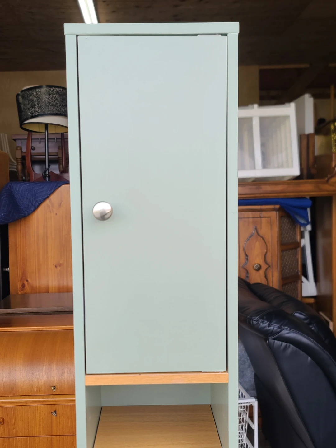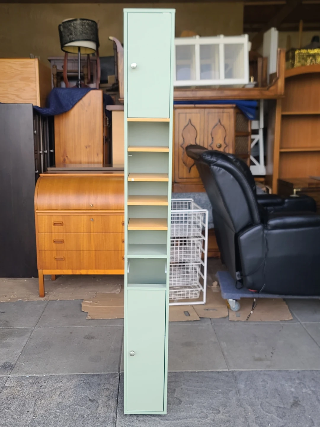 Slim storage unit. Has two closed cabinet sections, one on top and one on bottom. Middle section has open shelves, great for displaying stuff or extra storage. Light mint green color. Measurements: W 8' X D 8" X H 71". Delivery can be arranged. Viewing and pickup by appointment.