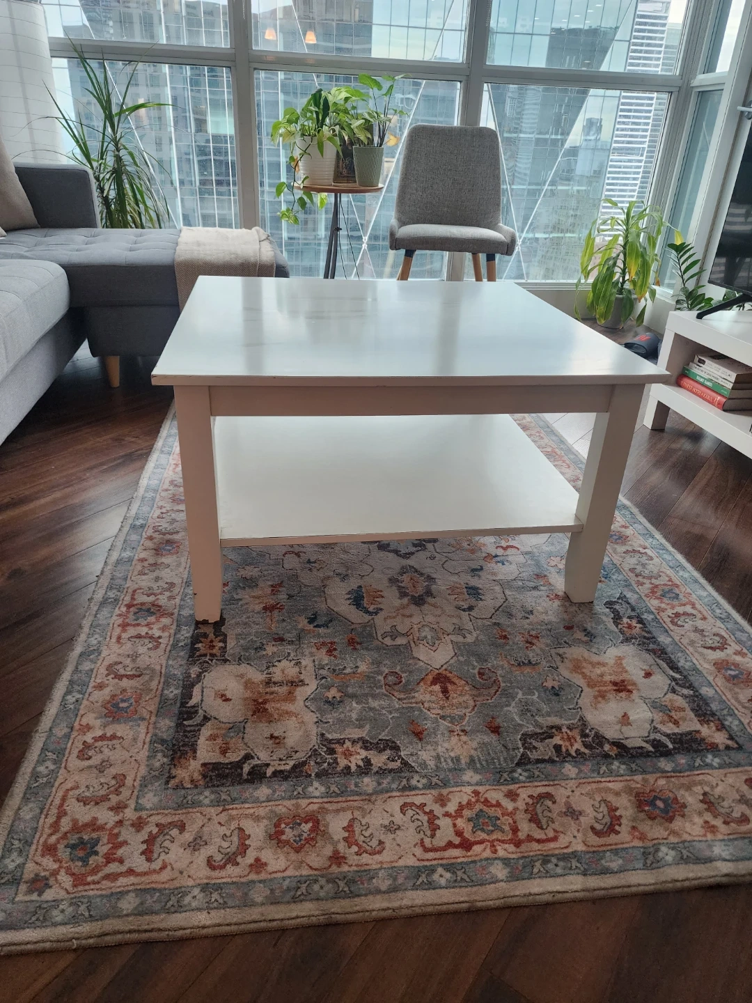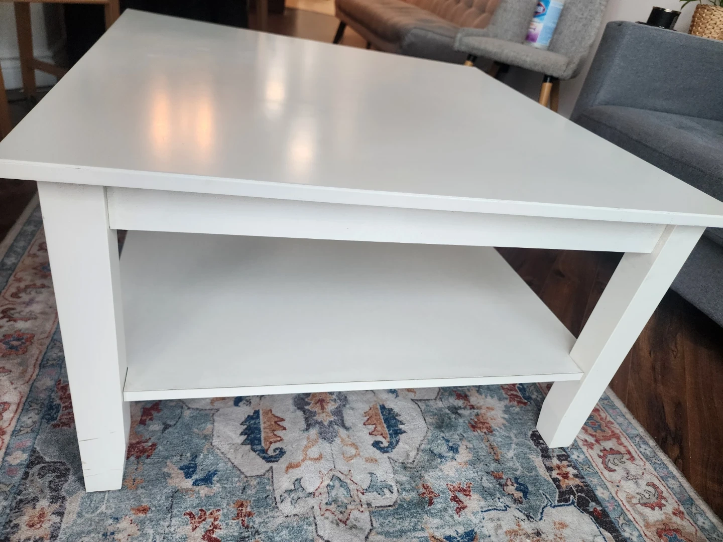 Selling a white coffee table that's perfect for any living room! It features a handy shelf underneath for extra storage. The table is 31.5" x 31.5" and 18.1" tall. There are some signs of use, but it's still in good condition!