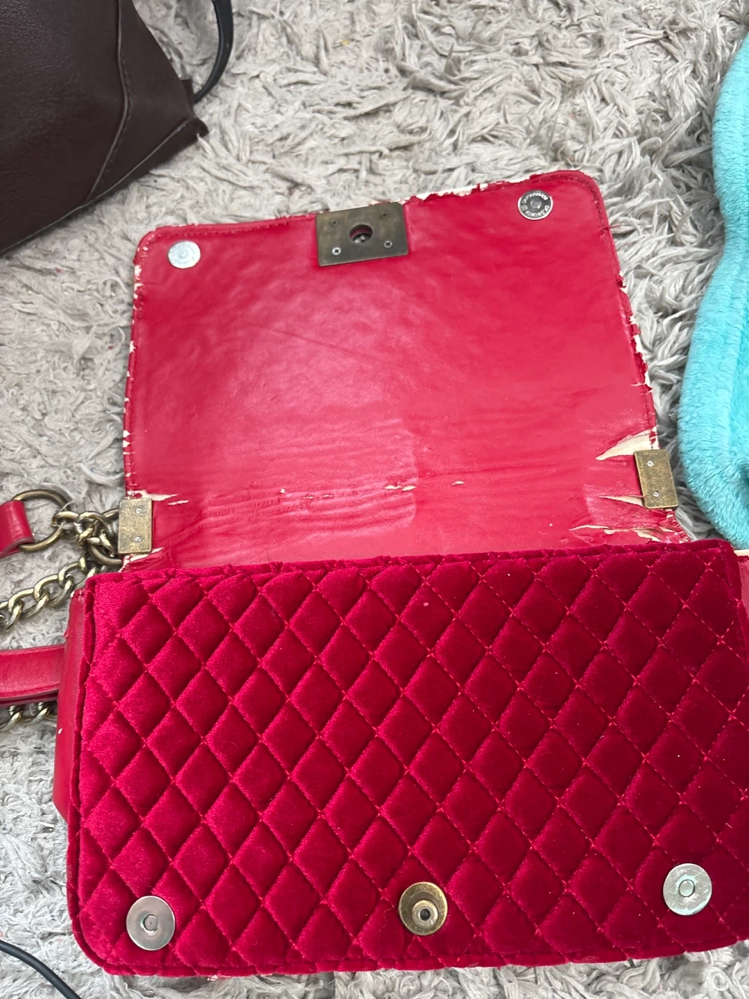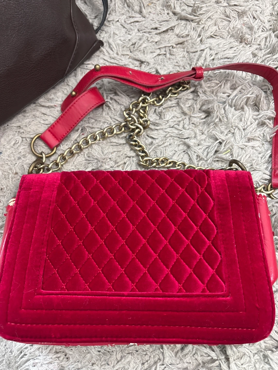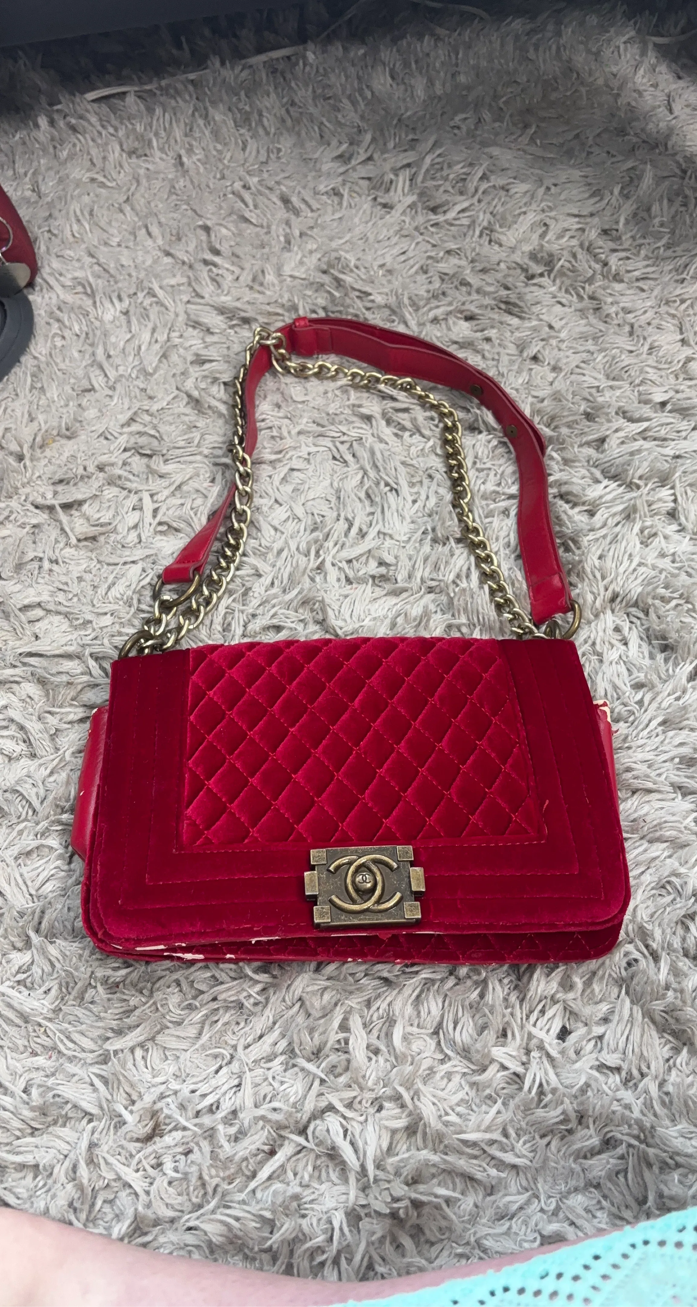 A stylish Chanel shoulder bag in red velvet with quilted detailing. It features a gold-tone chain strap. Some wear is visible on the edges and interior.
