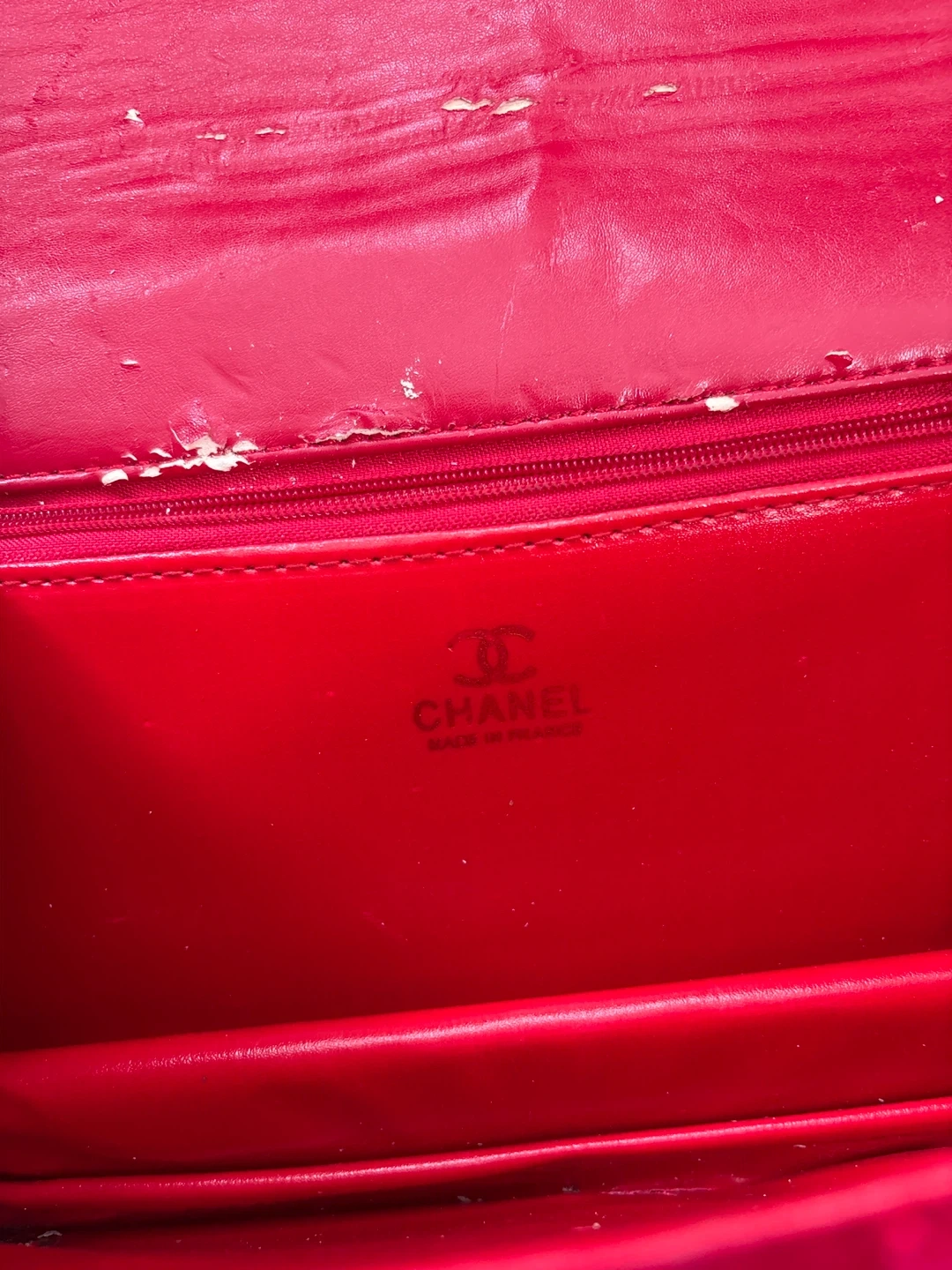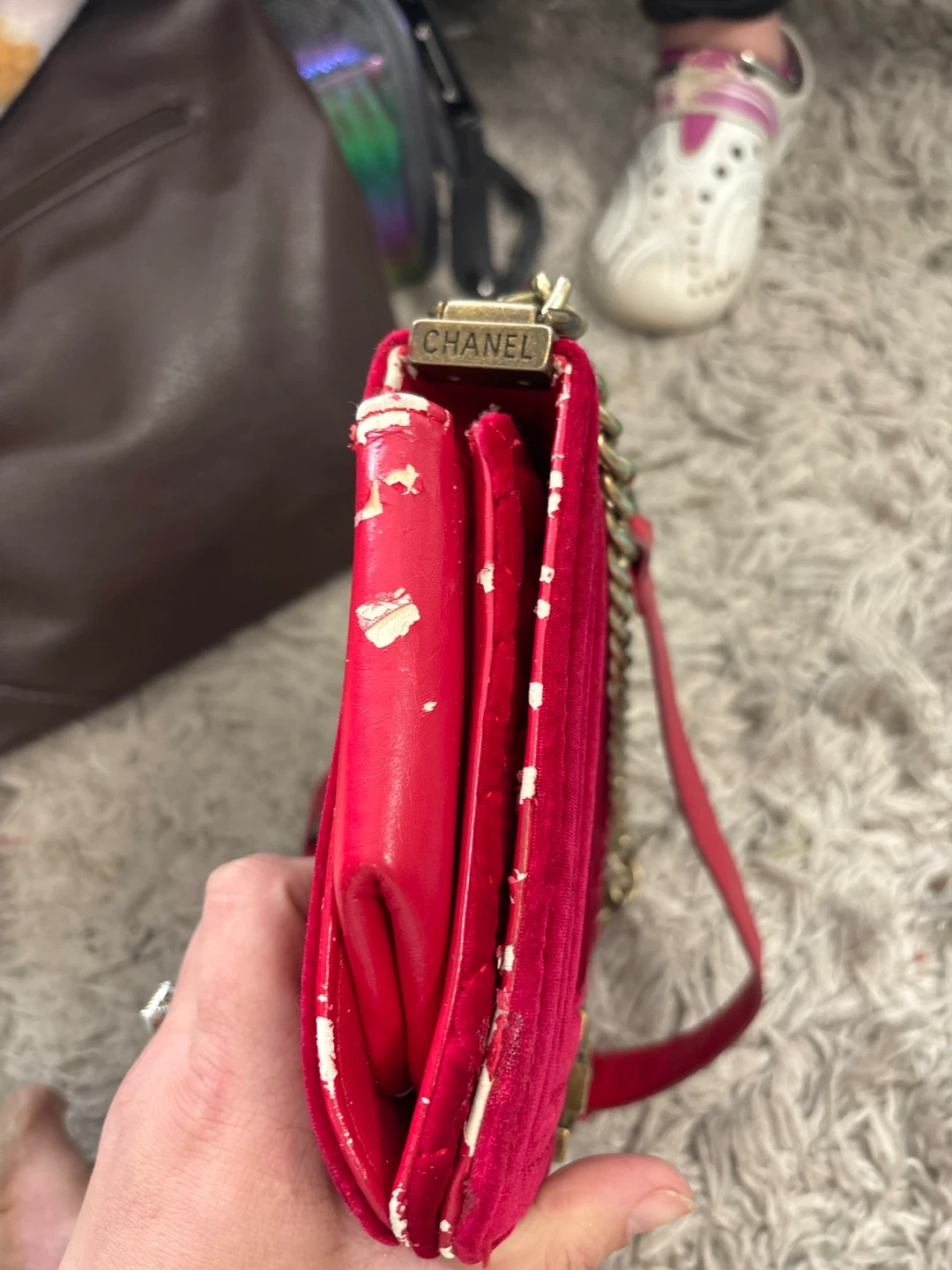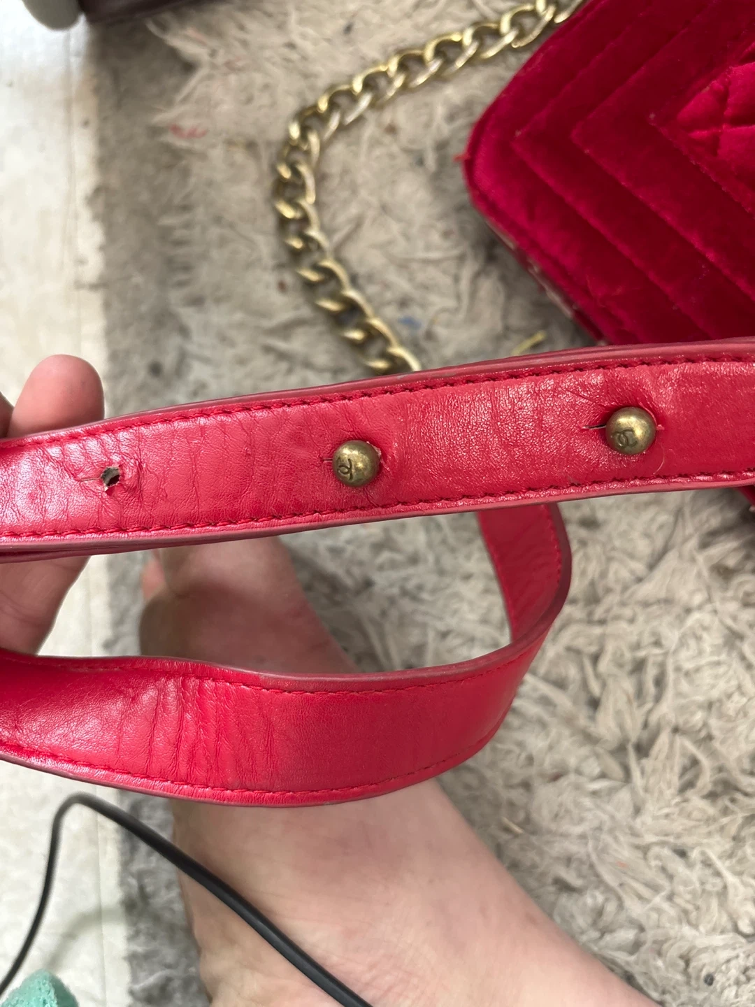 A stylish Chanel shoulder bag in red velvet with quilted detailing. It features a gold-tone chain strap. Some wear is visible on the edges and interior.